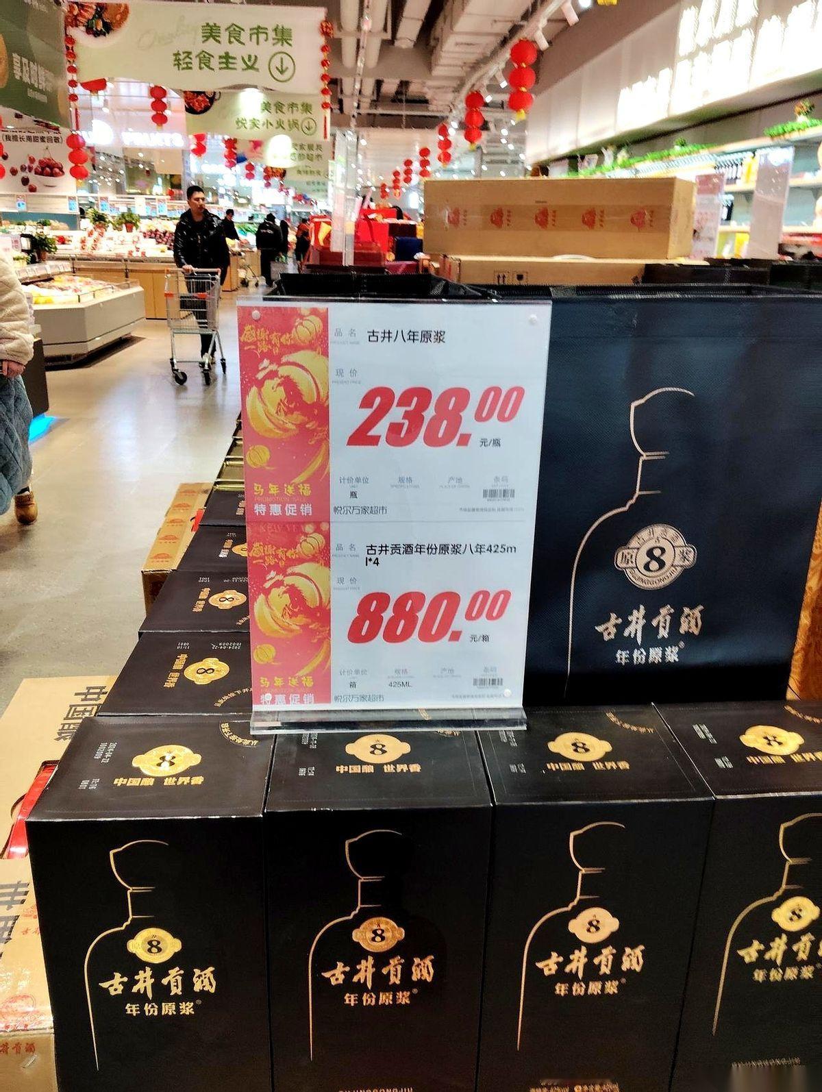 超市里灯火通明,我推着车,准备搬两箱酒。一箱给儿子送老丈人家,一箱自己过年待客。