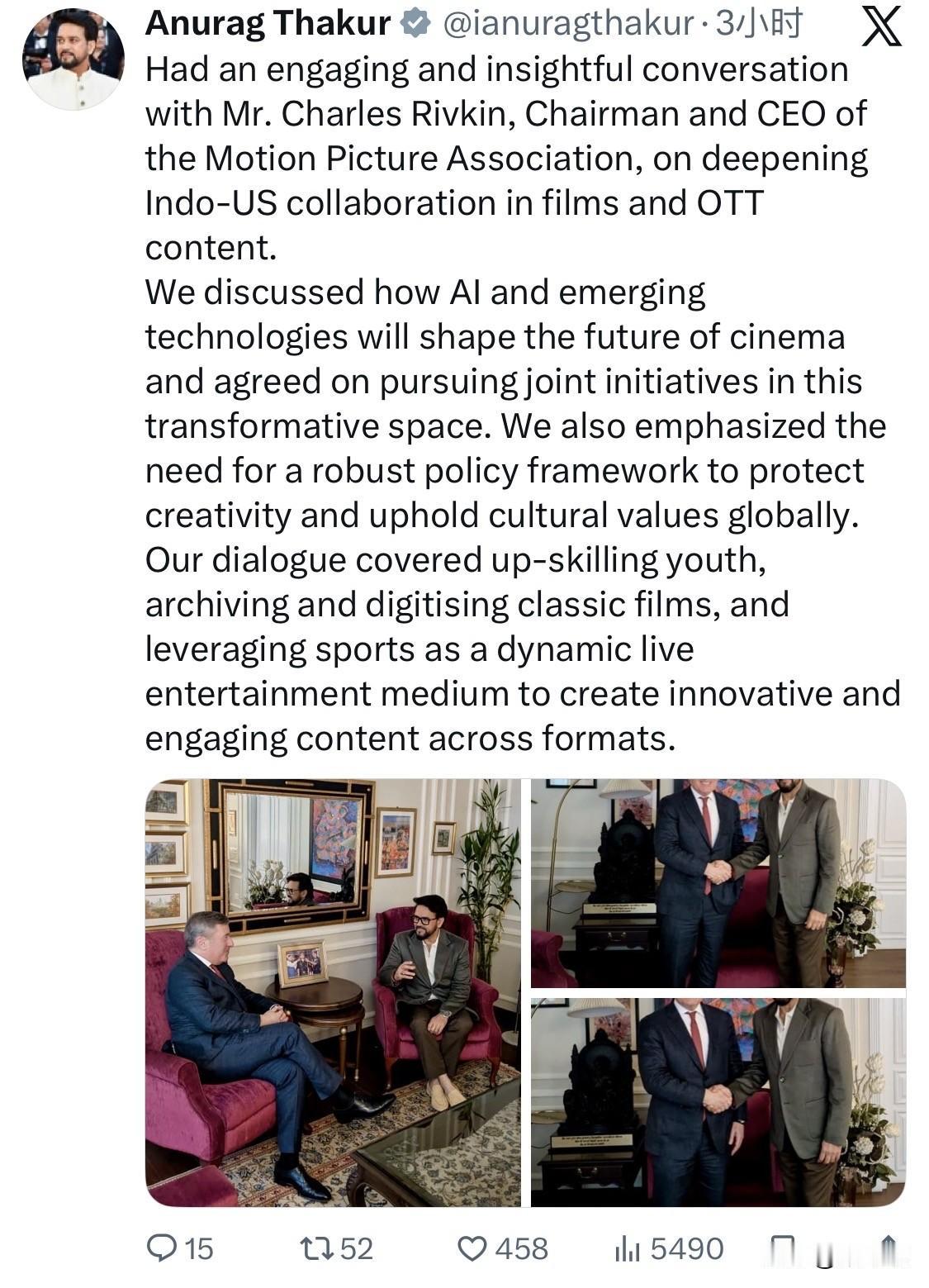 2026年2月16日,美国电影协会(MPA)主席兼首席执行官查尔斯·里夫金(Charles Rivkin)访问印度新德里,出席了由印度总理莫迪发起的印度AI影响力峰会(India AI Impact Summit 2026)。 里夫金与印度信息广播部、电子信息技术及铁道部部长阿什维尼·瓦什纳(Ashwini Vaishnaw)进行了名为“AI时代的创意未来”的炉边谈话。另外,印度人民党领导人,政治家阿努拉格·辛格·塔库尔(Anurag Singh Thakur)与美国电影协会(MPA)主席兼首席执行官查尔斯·里夫金(Charles Rivkin)也安排了一次会面。 里夫金强调,AI必须以负责任的方式用于扩展创意。他指出,MPA成员制片厂正处于技术转型的最前沿,利用AI增强叙事,同时坚持以人类创意为电影制作的核心。 他呼吁建立强有力的版权框架,认为这是创意经济活力、吸引媒体与娱乐行业投资以及将创意出口到全球的基石。 在访问期间,里夫金还就字节跳动旗下的AI工具Seedance 2.0涉及的大规模版权侵权问题发表了强硬声明,要求其停止侵权行为。 MPA与印度工商业联合会(FICCI)合作举办了官方卫星活动,名为“在AI时代奖励我们的创意未来——通过创新、信任和人才加强印度”,旨在将印度打造为全球内容枢纽。 里夫金在活动中分享了相关报告数据,指出印度电影、电视和流媒体行业每年创造超过600亿美元的经济产出,并支持了约260万个就业岗位。他表示,MPA成员制片厂(包括迪士尼、网飞、派拉蒙等)致力于通过投资和合作伙伴关系支持印度创意经济的进一步增长。