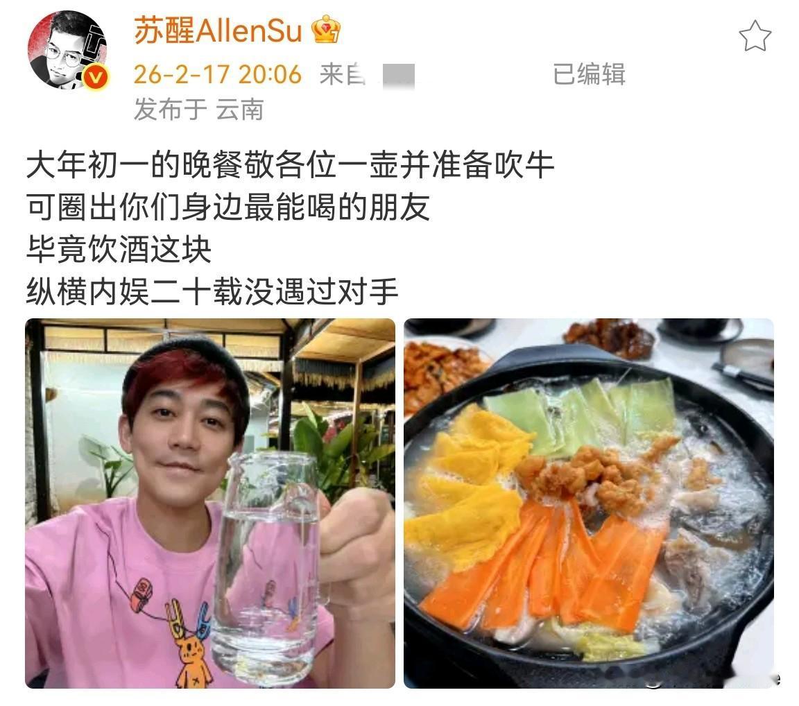 2月17日晚,苏醒更新动态,并晒出两张云南度假旅拍照,生活相当惬意。 醒哥身穿红色T恤,头戴黑色圆帽,手里端着酒杯,这是在敬网友吗? 看了一下另一张美食图片,菜品非常清淡,不知道是不是云南的特色菜。 同日,苏醒妻子廖语辰发文说:“别忘了,这一系列操作,我在你哥哥那里已经攒够经验咯。” 苏醒小儿子身穿红色外套,看起来非常帅气,但他好像在哭闹。 祝苏醒在新的一年事业顺利,阖家幸福。