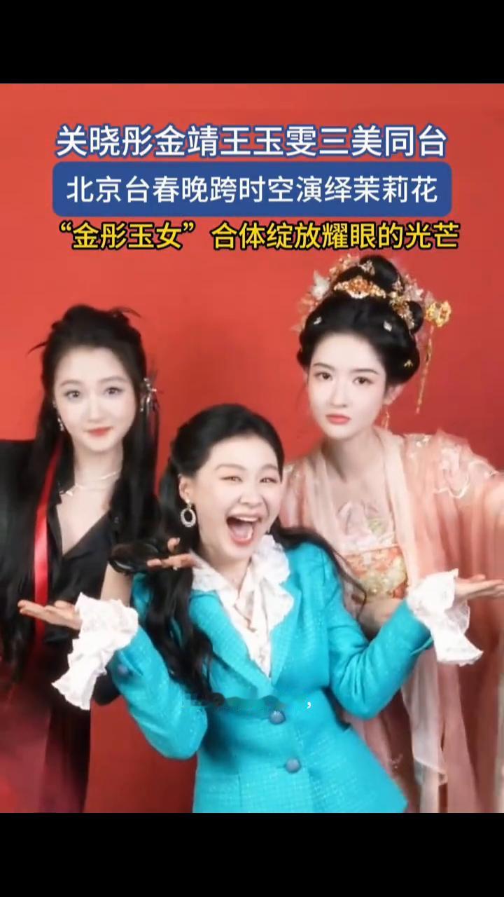 关晓彤、金靖、王玉雯三美同台,北京台春晚跨时空演绎茉莉花,"金彤玉女"合体绽放耀眼的光芒。 北京台春晚三美炸场,关晓彤红裙飒翻。大年初一19:30北京台春晚,关晓彤、金靖、王玉雯同台演《茉莉花》太绝了,三人扮年代三胞胎。王玉雯唐装温婉,金靖复古裙俏皮,关晓彤红马面裙帅到炸。跨三个时空演绎东方美,这波颜值暴击爱了。