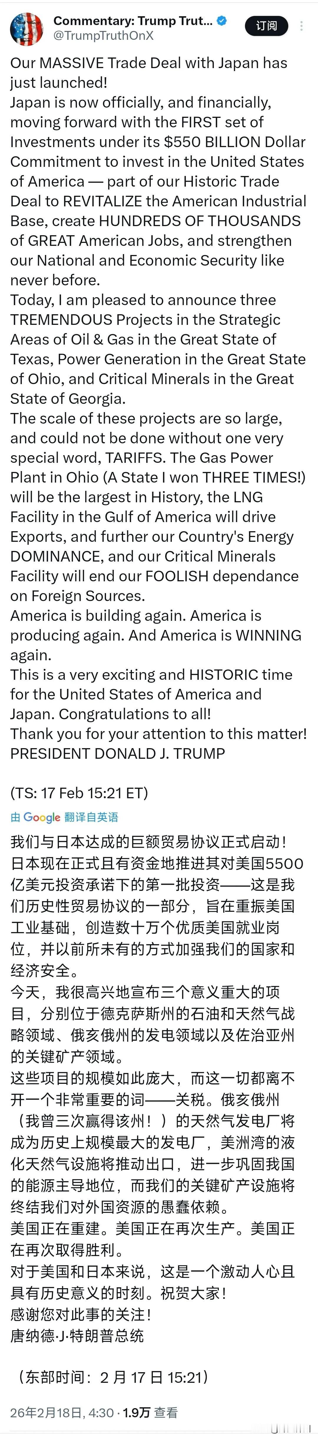 特朗普今天(北京时间2月18日)得意洋洋地发文写道:“我们与日本达成的巨额贸易协议正式启动!日本现在正式且有资金地推进其对美国5500亿美元投资承诺下的第一批投资,这是我们历史性贸易协议的一部分,旨在重振美国工业基础,创造数十万个优质美国就业岗位,并以前所未有的方式加强我们的国家和经济安全。 今天,我很高兴地宣布三个意义重大的项目,分别位于德克萨斯州的石油和天然气战略领域,俄亥俄州的发电领域以及佐治亚州的关键矿产领域。 这些项目的规模如此庞大,而这一切都离不开一个非常重要的词关税。俄亥俄州(我曾三次赢得该州!)的天然气发电厂将成为历史上规模最大的发电厂,美洲湾的液化天然气设施将推动出口,进一步巩固我国的能源主导地位,而我们的关键矿产设施将终结我们对外国资源的愚蠢依赖。 美国正在重建。美国正在再次生产。美国正在再次取得胜利。对于美国和日本来说,这是一个激动人心且具有历史意义的时刻。祝贺大家!” 评几句: 特朗普高调宣布,日美巨额贸易协议正式落地,日本首批兑现5500亿美元投资承诺,重点布局美国能源、发电、关键矿产等核心领域。特朗普直言,这一切都离不开关税手段,美国正在重新掌握产业与能源主导权。 表面看是双赢合作:美国拿到巨额投资,补强产业链短板;日本通过大手笔投入,缓和双边经贸关系。但明眼人都能看出,这场合作从一开始就重心倾斜。 美国借助强势政策吸引外资,本质是巩固自身经济与能源优势;日本的大规模投入,更多是经贸压力下的现实选择。特朗普高调造势,既是展示经济成绩,也带有明显的国内政治考量。 在全球格局快速调整的今天,大国之间的经贸往来,早已不只是简单的生意,更是一场关乎利益与话语权的战略博弈。