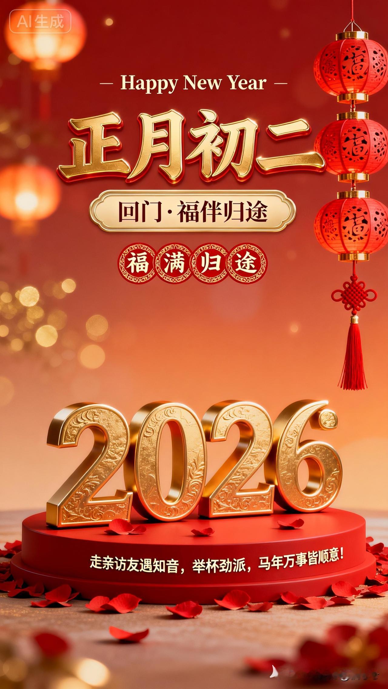 时间从不言语,却回答了所有问题。 它磨平棱角,也沉淀成长; 带走遗憾,也留下坚强。 我被时间温柔改变过: 从前执着对错,如今懂得释怀; 从前慌慌张张,如今慢慢从容。 大年初二,迎福纳祥。 回门叙情,喜乐安康; 愿你手中有财,心中有光。 心简单,路才好走; 珍惜当下,就是最好的时光。 马年初二,祝你步履轻盈,万事顺遂!