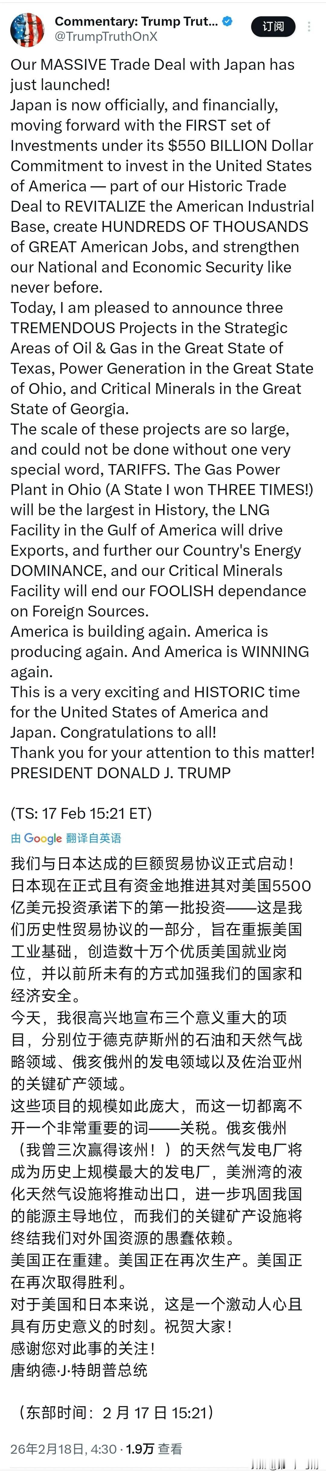 特朗普今天(北京时间2月18日)得意洋洋地发文写道:“我们与日本达成的巨额贸易协议正式启动!日本现在正式且有资金地推进其对美国5500亿美元投资承诺下的第一批投资,这是我们历史性贸易协议的一部分,旨在重振美国工业基础,创造数十万个优质美国就业岗位,并以前所未有的方式加强我们的国家和经济安全。 今天,我很高兴地宣布三个意义重大的项目,分别位于德克萨斯州的石油和天然气战略领域,俄亥俄州的发电领域以及佐治亚州的关键矿产领域。 这些项目的规模如此庞大,而这一切都离不开一个非常重要的词关税。俄亥俄州(我曾三次赢得该州!)的天然气发电厂将成为历史上规模最大的发电厂,美洲湾的液化天然气设施将推动出口,进一步巩固我国的能源主导地位,而我们的关键矿产设施将终结我们对外国资源的愚蠢依赖。 美国正在重建。美国正在再次生产。美国正在再次取得胜利。对于美国和日本来说,这是一个激动人心且具有历史意义的时刻。祝贺大家!” 评几句 这是一个非常典型的特朗普式宣言——宏大叙事包装下的政治表演,值得逐层剥开来看。 "历史性"这个词在特朗普词典里已经通货膨胀到一文不值。 5500亿美元的投资承诺听起来震撼,但细究起来,这更像是把日本企业早已规划好的存量投资重新贴牌打包。日本对美直接投资在过去十年持续增长,丰田、索尼等巨头在美国的布局早成定局,特朗普不过是把别人的成绩单强行签上自己的名字,就像他在高尔夫球赛上惯用的手法——球明明还在长草区,记分卡上已经记了小鸟球。 更值得玩味的是这三个"精心挑选"的选址。 德克萨斯、俄亥俄、佐治亚——三个摇摆州,其中俄亥俄被他特别强调"曾三次赢得"。这哪里是什么经济战略,分明是2026年中期选举的政治地图。把能源设施和关键矿产项目当作政治筹码,用联邦政策为个人选举利益输送,这种公器私用的赤裸程度,在当代美国总统中堪称"史无前例"。 而"关税"一词的自我标榜,暴露了整个话语体系的荒谬。 他声称这些项目"离不开关税",却刻意回避一个基本事实:正是他第一任期对日钢铝关税的反复无常,以及近期威胁对全球加征关税的恐慌氛围,才迫使日本以投资换平安。这不是双赢的贸易协议,这是现代版的保护费征收——只不过收保护费的穿上了总统礼服,还要求在电视上直播感恩仪式。