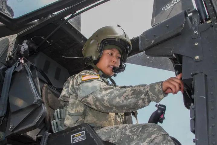 来自第2航空团第2航空团第4空中侦察营的AH-64阿帕奇直升机飞行员莎拉·全中尉,站在驻韩国美军基地汉弗莱营第4-2航空团机库内,站在一架阿帕奇直升机前。全是美国陆军中最早的女性韩国阿帕奇飞行员之一。