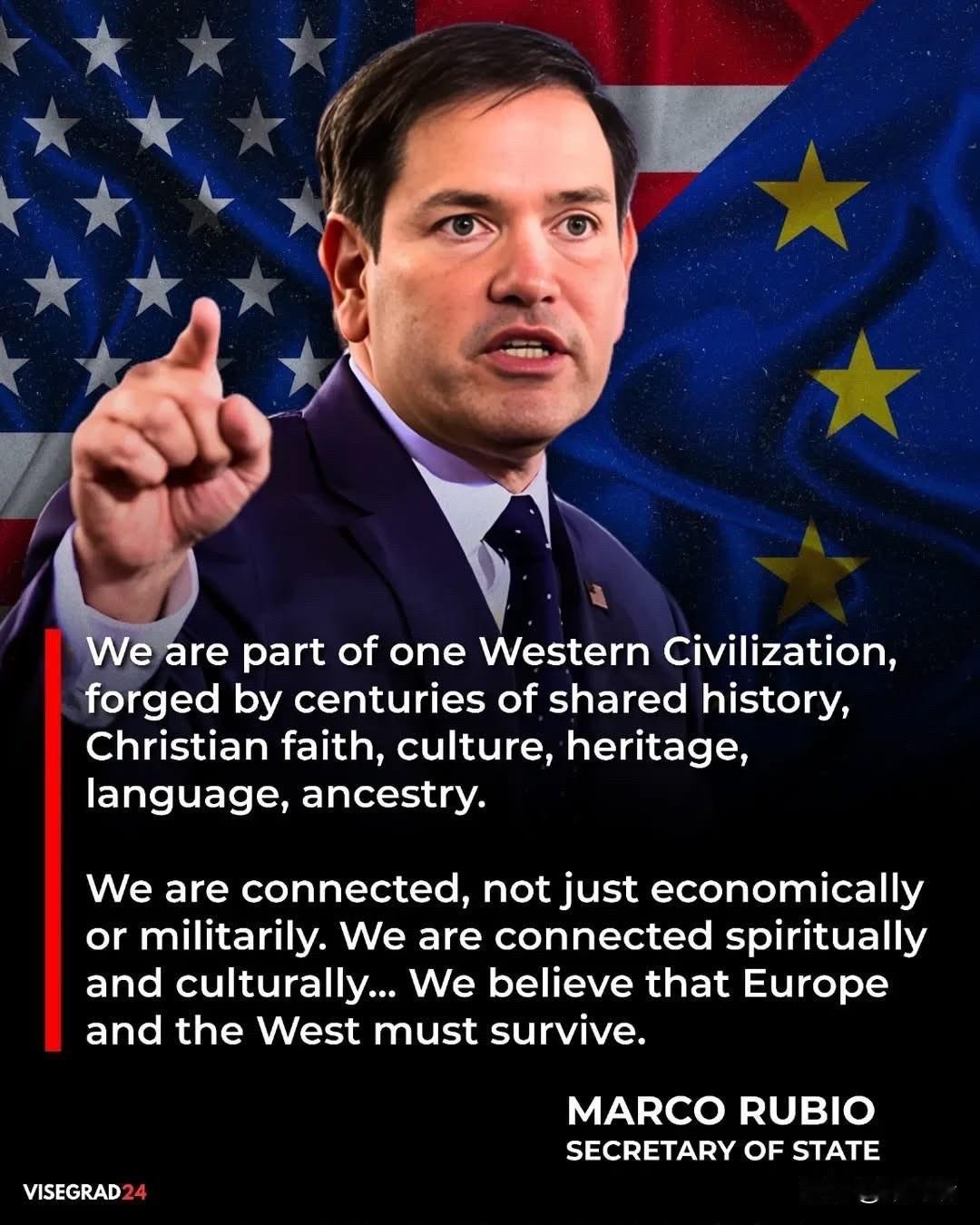 美国国务卿鲁比奥在慕尼黑安全会议上就跨大西洋关系和西方文明的未来发表了重要讲话: “我们准备独自完成这项工作,但我们更希望,也更愿意与我们在欧洲的朋友们一起完成这项工作。 美国建国至今已有250年,但它的根基早在很久以前就已在这片大陆上扎根。那些定居并建设我出生之地的先民们,带着先辈们的记忆、传统和基督教信仰来到这片土地,视之为神圣的遗产,是连接旧世界与新世界的不可分割的纽带。 我们同属一个文明——西方文明。我们彼此之间有着国家间最深厚的纽带,这种纽带是由几个世纪以来共同的历史、基督教信仰、文化、遗产、语言、血统以及我们的先辈为我们如今继承的共同文明所做出的牺牲铸就的。 即使我们有时意见相左,这些分歧也源于我们对欧洲的深切关切。我们与欧洲的联系不仅体现在经济上,也体现在军事上。我们与欧洲在精神上和文化上紧密相连。我们希望欧洲强大。我们相信,欧洲和西方必须生存下去。