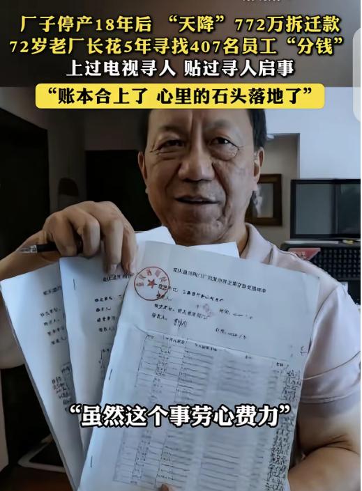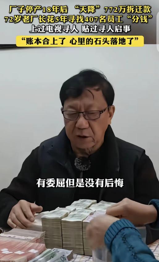 “这做人杠杠的!”重庆,一72岁老厂长,厂子停产18年后,突然厂子拆迁,获赔772万拆迁款,老厂长花5年,寻找散落各地的407个员工,甚至上电视寻人,终于把钱都分了下去,老厂长:账本合上了,心里的石头落地了。 2006年工厂倒闭,账户早已注销,772万巨款竟在18年后离奇打入老厂长郭重智的私人账户。法律上,这是主体灭失后的“无主之财”。人情上,是72岁老人晚年的财富自由。但这笔钱不仅没让他狂喜,反而让他拎起两麻袋发霉的账本,开启了一场长达五年的“逆向发钱”马拉松。 当手机屏幕上跳出那串长得惊人的数字时,大多数人的第一反应恐怕是心跳骤停。772万元。收款人:郭重智。 这不是电信诈骗,也不是彩票中奖,而是一笔迟到了18年的土地补偿款。 此时的重庆通用阀门厂,早已是一片沉寂的废墟。2006年工厂彻底停产,机器卖了,厂房空了,连对公账户都注销得干干净净。这笔巨款,沿着法律的缝隙,只能打入最后一任厂长郭重智的个人账户。 如果是你,你会怎么做? 法律上,这笔钱进了私账,工厂法人主体灭失,似乎成了一笔无主之财。人情上,亲戚朋友苦口婆心地劝:72岁了,干了一辈子革命工作,厂子都没了,谁还能找后账?这钱留着养老,天经地义。 但郭重智看着银行卡里的余额,眉头都没展一下。他转身回屋,从角落里拖出了两个积满灰尘的麻袋。 麻袋打开,一股陈旧的纸张霉味扑鼻而来。那是两麻袋发黄、发脆的工资台账和职工花名册。有些纸页一碰就要碎,上面的字迹已经模糊,但每一个名字背后,都站着一个曾经在这片厂房里流过汗的大活人。 “这是407个老弟兄的血汗钱,跟我个人的腰包,没有半毛钱关系。”郭重智把话撂在了桌面上,硬邦邦的,砸得地上有坑。 一场长达五年的“逆向讨薪”就这样开始了。 别人是讨薪难,他是发钱难。407位员工,历经十八载沧海桑田之变,那些一同走过的岁月如白驹过隙。如今,他们已然星散天涯,各自奔赴不同的人生旅程。有的去了外地带孙子,有的换了三四次电话,有的甚至已经把户口迁到了千里之外。 郭重智没请会计,也没找中介。这位古稀老人戴着老花镜,在台灯下一页页翻那些脆得像饼干一样的旧账本。 他要算工龄,要算职级,要从那772万的总盘子里,把每一分钱精确地切分到每一个名字头上。 这不是做账,这是在修补一段断裂的历史。 算好了账,还得找人。郭重智拉上几个还联系得上的老同事,成立了“分配小组”。 过去五年间,他们的足迹如一张巨网,广泛铺陈开来,几乎撒遍大半个华夏大地,于广袤国土上留下了深刻的探寻印记。四川、贵州、云南……十多个省市,绿皮火车、长途大巴、甚至是两条腿走路。 没有电话,就按着几十年前的老地址去敲门。找不到人,就去求助当地派出所和社区。实在无计可施之际,这帮老者竟想出了“上电视寻人”这一办法。他们在困境中绞尽脑汁,最终使出此招,期望借此寻得目标。 最让旁人看不懂的是,这一路上的车票、住宿、饭钱,郭重智没动那772万里的一分一厘。 他倔得像头牛,所有的差旅费全从自己那点退休金里抠。他说,那772万是专款,每笔钱装进信封时,必须写清姓名金额,分毫不差,这是规矩,也是底线。 寻找的过程中,也不是没有杂音。有人怀疑他私吞,有人质疑分配不公。面对这些风言风语,郭重智也不辩解,只是默默把那本记得密密麻麻的账本摊开——白纸黑字,见得了天,对得起良心。 最令人动容的一幕,往往发生在那些破旧的筒子楼里。 郭重智几经辗转,寻到那些离世二三十年的老职工家属。然而,当他出现在对方面前时,家属们大多一脸茫然,往昔记忆似已被岁月悄然尘封。他们压根不知道还有这笔钱,更没想到,时隔这么多年,还有人记得自家逝去的亲人。 当那个写着金额的信封交到遗孀或子女手中时,很多人当场就哭出了声。这哪是钱啊,这是一份被人记挂了一辈子的尊严。 时间走到今年,2026年的1月16日,最后一笔19万余元的余款终于有了着落。 在重庆那个略显寒冷的冬日里,72岁的郭重智做完了最后一笔转账。 19岁那年,他踏入工厂,自此开启了与阀门、钢铁为伴的生涯。从普通工人起步,凭借不懈努力,一路晋升为车间主任,乃至厂长,半生时光都在这钢铁世界里度过。他这一生,未曾坐拥万贯资财而发巨财,亦未成就震古烁今之伟业。虽无显赫财富与惊人壮举,却也在平凡中度过了属于自己的时光。 但在这件事上,他用五年时间,给“厂长”这两个字,写下了最厚重的注脚。 此时此刻,看着空空如也的待分配名单,郭重智缓缓合上了那本被翻得卷了边的账本。 他未发任何豪言壮语,只是神色平静,语调淡淡地说道:“账本合上之际,心中那块沉甸甸的石头,终是落了地。” 他守住的,不仅仅是407个家庭的权益,更是一代中国人骨子里那股“做人要正”的硬气。