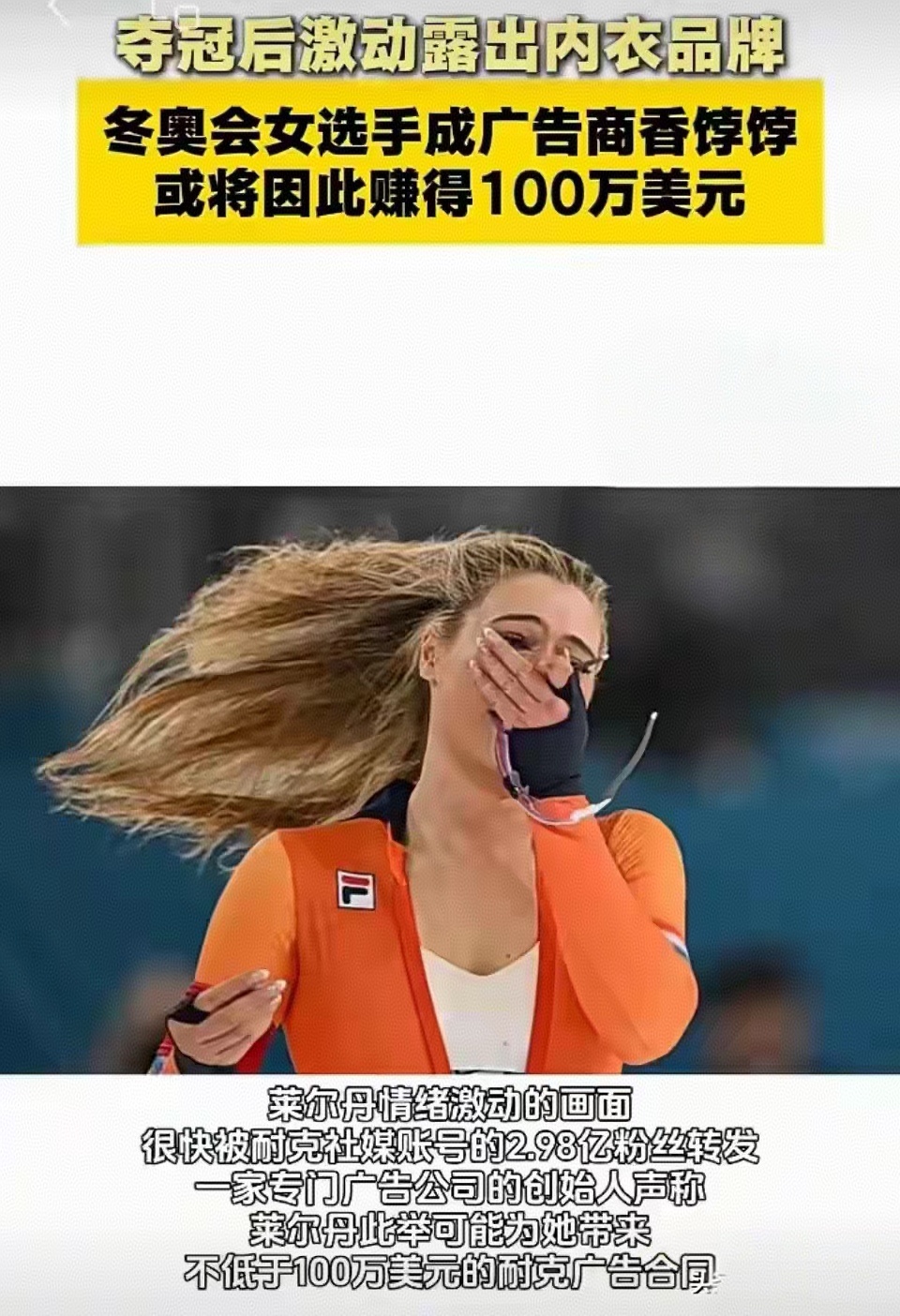 冬奥会露内衣品牌女选手引来广告商 100万美元是荷兰专业体育营销专家给出的精准估价,另外她INS坐拥620万粉丝,单条广告就能赚7万多美元,这次全球刷屏相当于免费的顶级广告。这不是天上掉钱,而是她用金牌实力+顶级热度+真性情,实打实换来的真金白银。别人夺冠只拿比赛奖金,而她夺冠直接把个人商业价值拉到了天花板。赛场够硬,性格够真,流量够大,这才是顶级运动员最厉害的地方。V观冬奥会体育大拜年