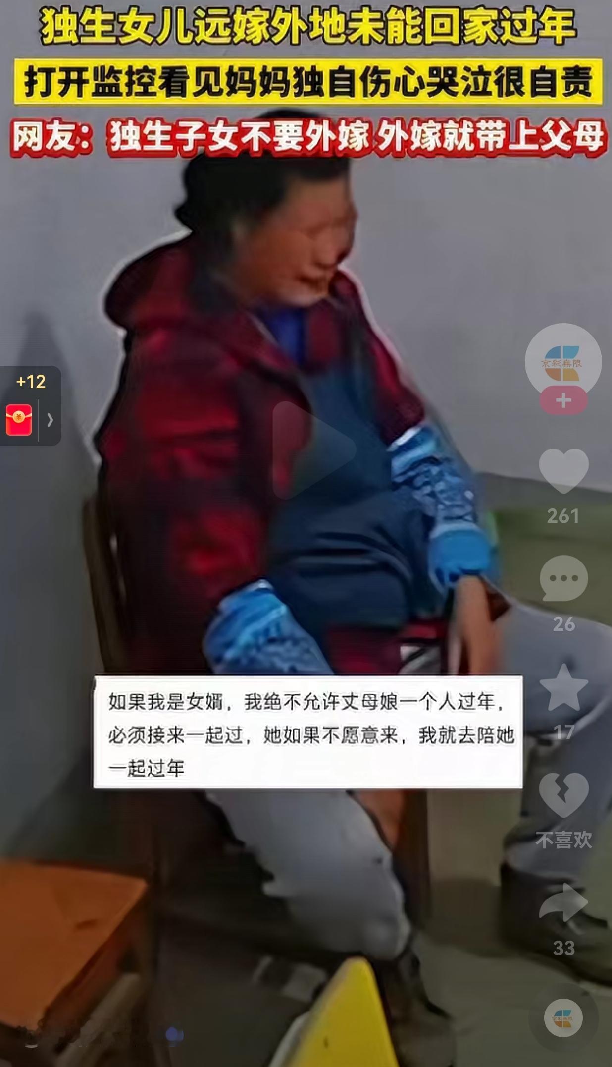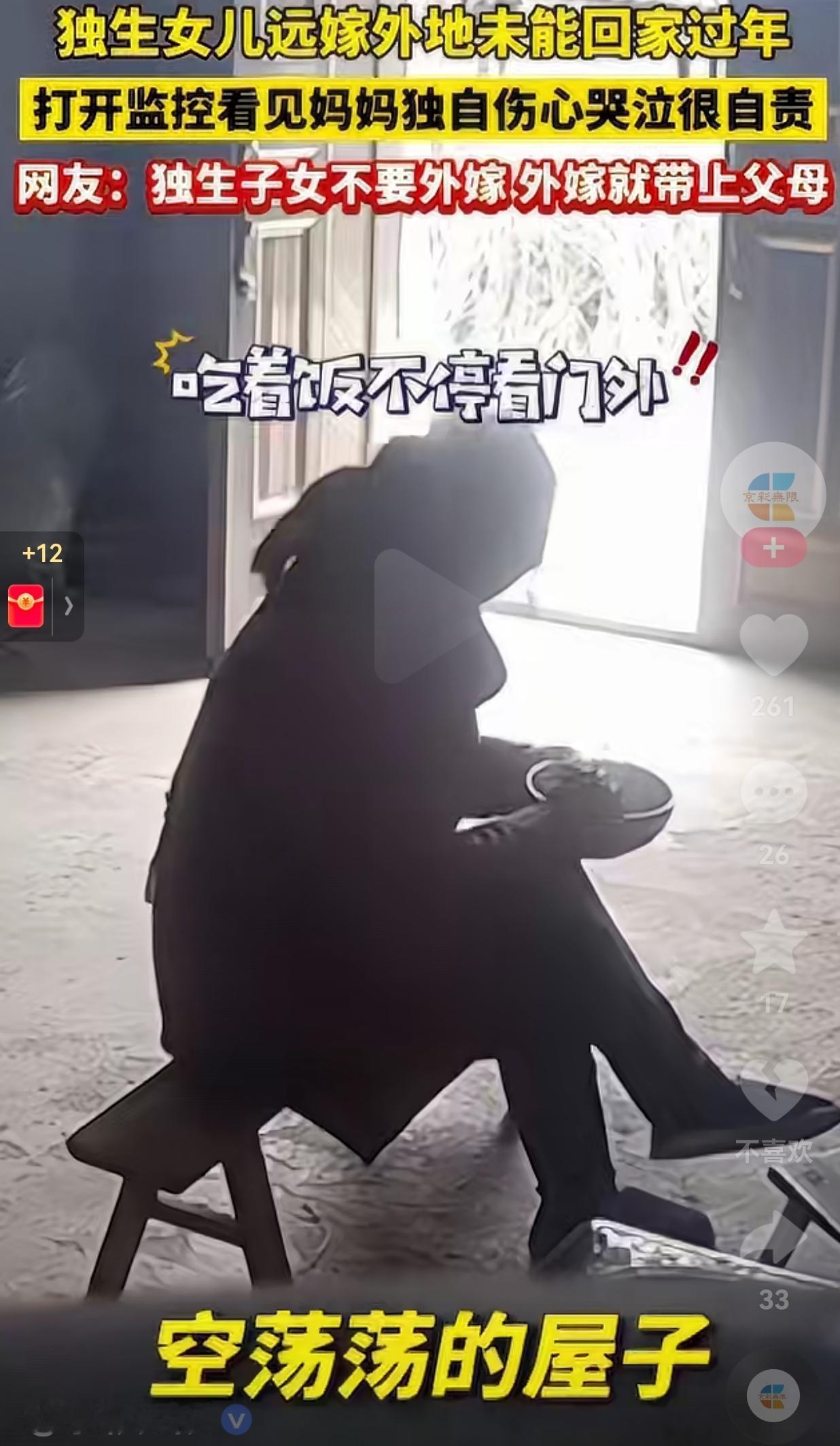 独生子女的痛,谁懂?今年大年初一,远嫁千里之外的女子,没有回家陪母亲过年,这天她像往常一样点开家里的监控,想看看妈有没有过得怎么样? 当女子打开监控时,只见她一个人坐在门口的水泥台阶上,手里端着碗,面前的碗里,饺子还冒着热气,她却一口没动。 女子以为她只是在发呆,直到她肩膀开始剧烈抖动,才听见她压抑的哭声。 “老头子,我要到你那里来……” 她对着空气喊着女子去世的爸,声音撕心裂肺地呐喊。那一刻,女子手里的手机“啪”地掉在地上,眼泪瞬间糊了满脸。 女子是家里的独生女,当年为了爱情,义无反顾地远嫁他乡。她总以为,交通这么方便,想回家随时都能回。她总以为,妈身体硬朗,一个人也能把日子过好。 可她忘了,过年的意义,从来不是吃一顿饺子,而是一家人围坐在一起的热闹。 监控里的画面,像一把刀,一下一下扎在女子心上。 白天,她端着碗坐在门口,眼睛直勾勾地望着村口的路,吃着饭还不停往门外看,盼着女子能像小时候一样,蹦蹦跳跳地喊着“妈,我回来了”。 晚上,她一个人守着空荡荡的屋子,坐在椅子上抹眼泪,连个说话的人都没有。 女子突然想起,结婚那天,她穿着婚纱,笑着对妈说:“妈,我会常回来看你的。”她笑着点头,转身却在女子看不见的地方,偷偷抹掉了眼泪。 原来,女子所谓的“常回家看看”,在她漫长的等待里,变成了一年一次的奢望。 有网友看到后评论说:“独生子女不要外嫁,外嫁就带上父母。” 还有的网友说:“如果我是女婿,我绝不允许丈母娘一个人过年,必须接来一起过,她如果不愿意来,我就去陪她一起过年。” 这些话,字字戳心。 我想女子不是不爱她妈,她只是被生活的琐碎困住了脚步。她以为给她打钱、买东西就是孝顺,却忘了她最想要的,只是自己能陪在她身边,听她唠叨几句家长里短。 远嫁,不是不孝,而是一场豪赌。赌的是,你爱的人,会不会像你爱他一样,爱你的父母。赌的是,你有足够的能力,把思念变成脚下的路,随时回到那个生你养你的地方。 可现实是,大多数时候,我们都输了。 我们输给了距离,输给了柴米油盐,输给了那句“等我有空了”。 今年过年,女子又没能回去。她给妈打视频电话,她笑着说:“我挺好的,你别担心,好好在那边过年。”可女子分明看见,她身后的沙发上,还放着自己小时候盖的那条毯子。 那条毯子,是她想女子的时候,唯一能抓住的念想。 女子常常在想,如果当初自己没有远嫁,是不是一切都会不一样? 是不是她就能在她生病的时候,端一杯热水,喂她吃药。是不是她就能在她想自己的时候,给她一个拥抱,告诉她“妈,我在”;是不是她就不会在过年的时候,一个人坐在门槛上,对着空气喊着自己爸的名字。 可人生没有如果,只有后果和结果。 我们这一代独生子女,肩上扛着的,是四个老人的晚年,是自己小家庭的重担。我们像被夹在中间的三明治,一边是远方的父母,一边是眼前的生活,动弹不得。 但我想说的是,再难,也别让父母的等待,变成遗憾。 针对此事,你有什么看法呢?