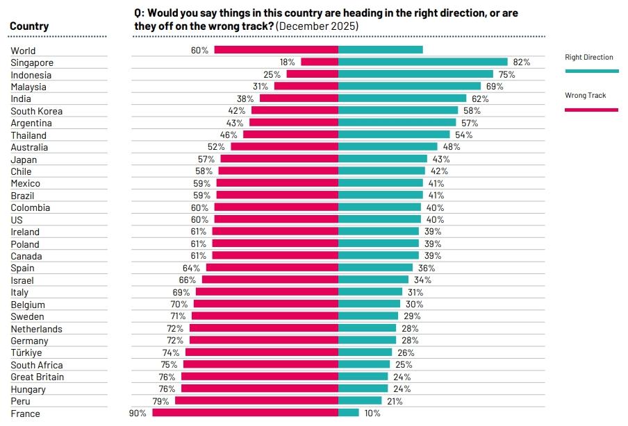 这个调查是2025年12月做的,问人国家是不是在正确的方向上,调查了30个国家。新加坡、印尼、马来西亚、印度、韩国有82%、75%、69%、62%、58%的人认为是在正确方向上,亚洲国家明显乐观。