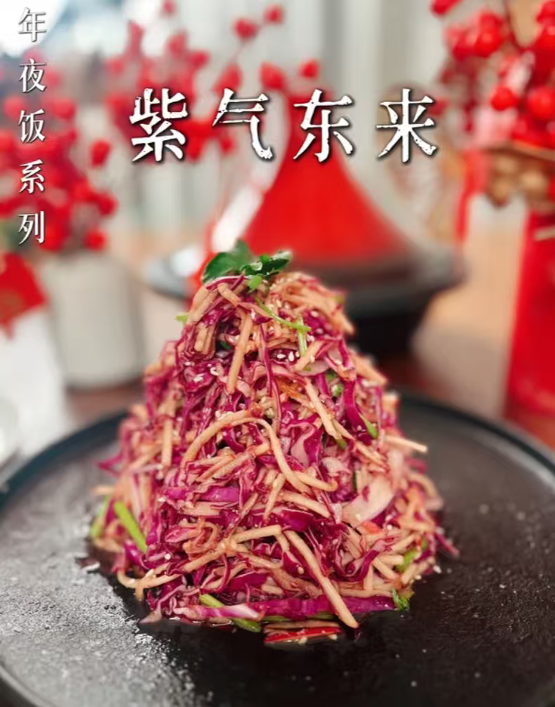 原来紫色上了饭桌这么好看!而且放在春节团圆饭里,吃的时候一起说句“紫定发财”,是再应景不过了!建议大家也可以试着添一道紫色漂亮菜,比如什么紫薯、紫米、茄子等等,图个紫气东来、紫定发财的好彩头!当然了,我个人比较喜欢的紫色漂亮菜是紫甘蓝,既符合紫色玄学,而且热量低负担低,吃了大鱼大肉后还能解腻。毕竟要好运,也要健康嘛~杭州人过年集体追紫紫色漂亮菜成杭州春节饭桌新宠