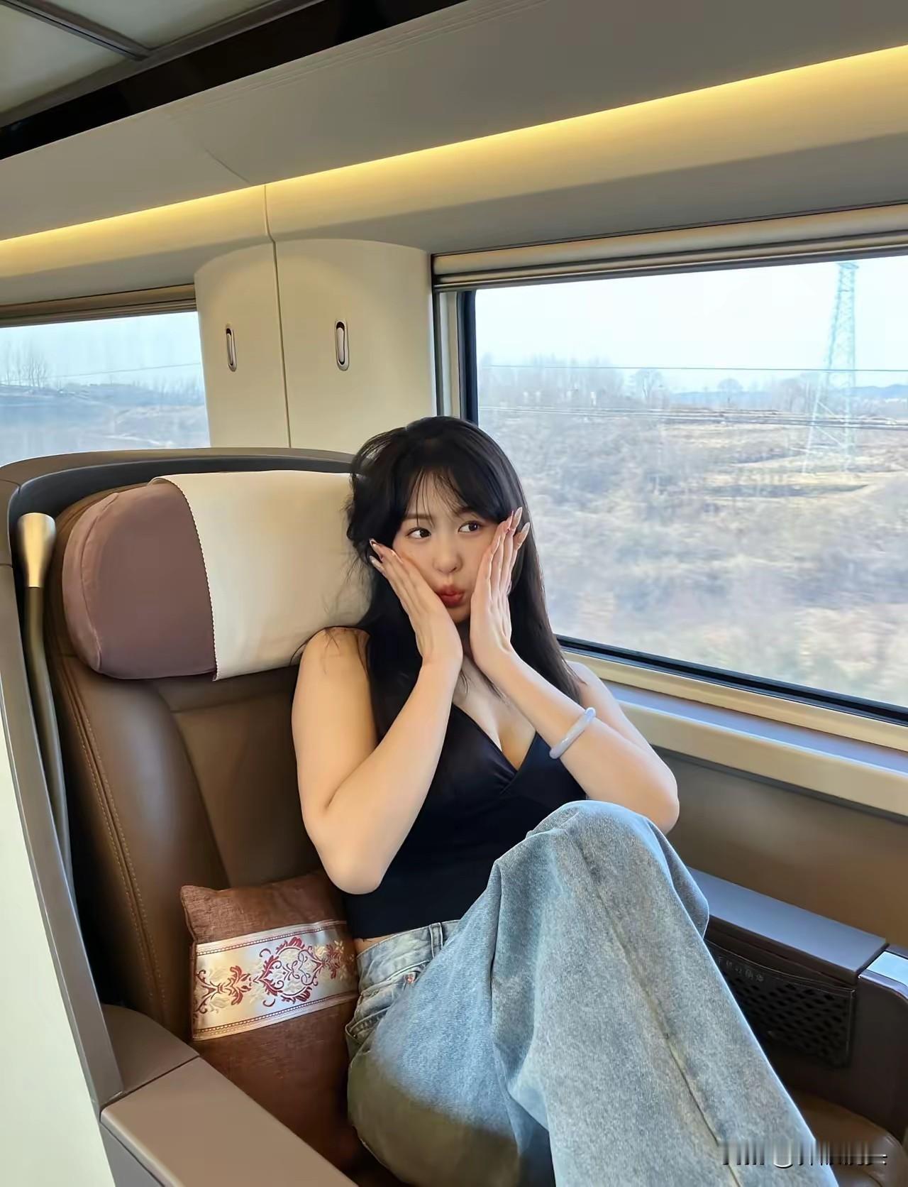 🚄💃 在高铁上享受悠闲时光,比个V字,心情美美哒!😊🌿