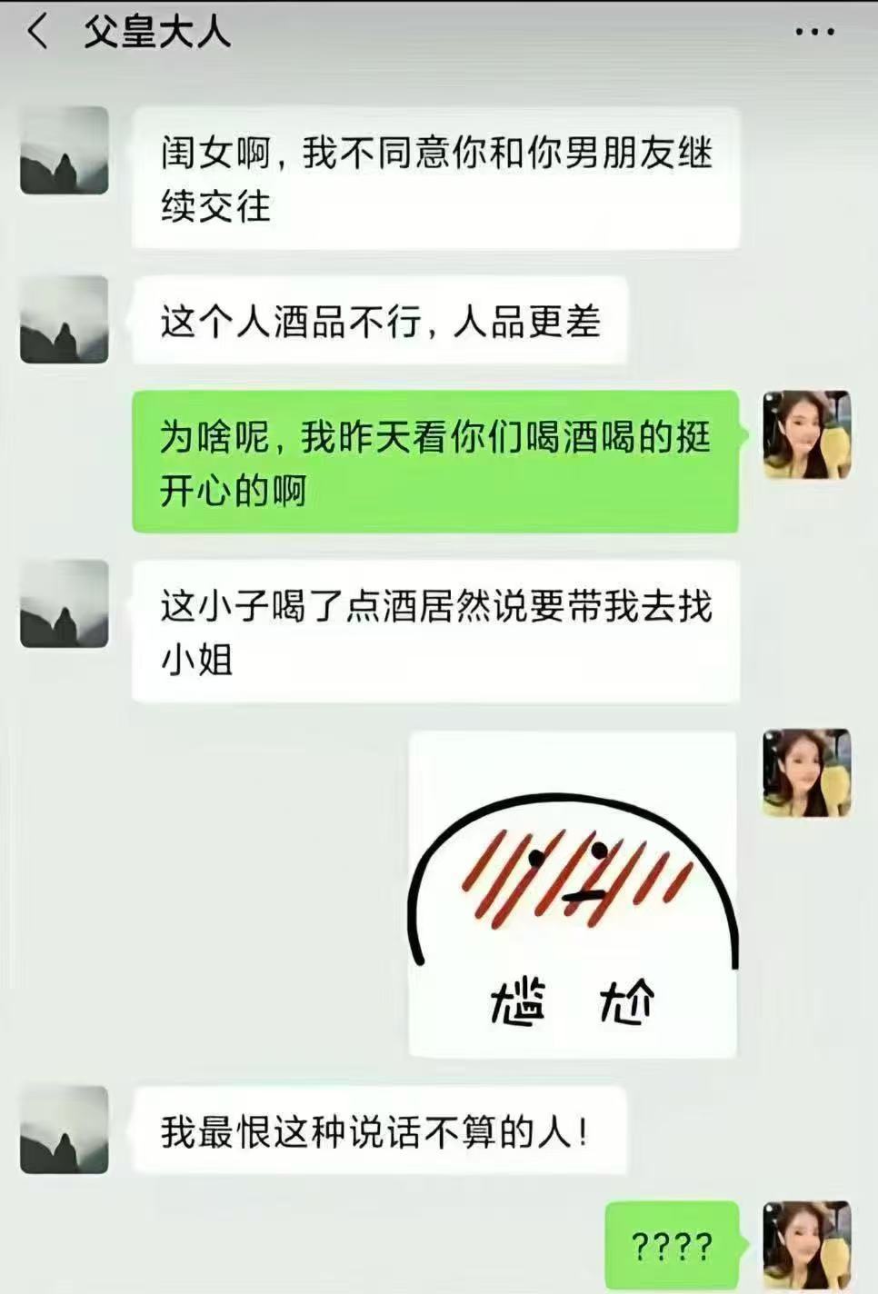 搞笑内涵图 【这男友和老丈人,一个敢说一个敢信😂做人最重要是讲诚信】 段子:我爸不同意我和男友继续交往,说他人品差。我还纳闷昨天他俩喝酒不是挺开心的吗?结果我爸说:“这小子喝了点酒,居然说要带我去找小姐……”我正尴尬到抠脚,我爸又补了一句:“我最恨这种说话不算的人!”我:??????段子离谱男友老丈人的底线 做人要诚信