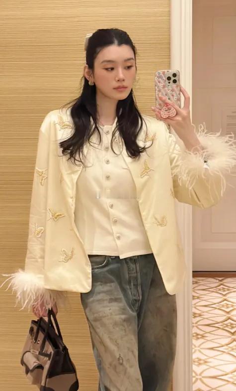 奚梦瑶新年第一天晒美照,和老公何猷君看NBA,穿着一身黑特别有气场,新年造型也是yyds了,新中式白色刺绣看起来就是豪门太太的既视感!