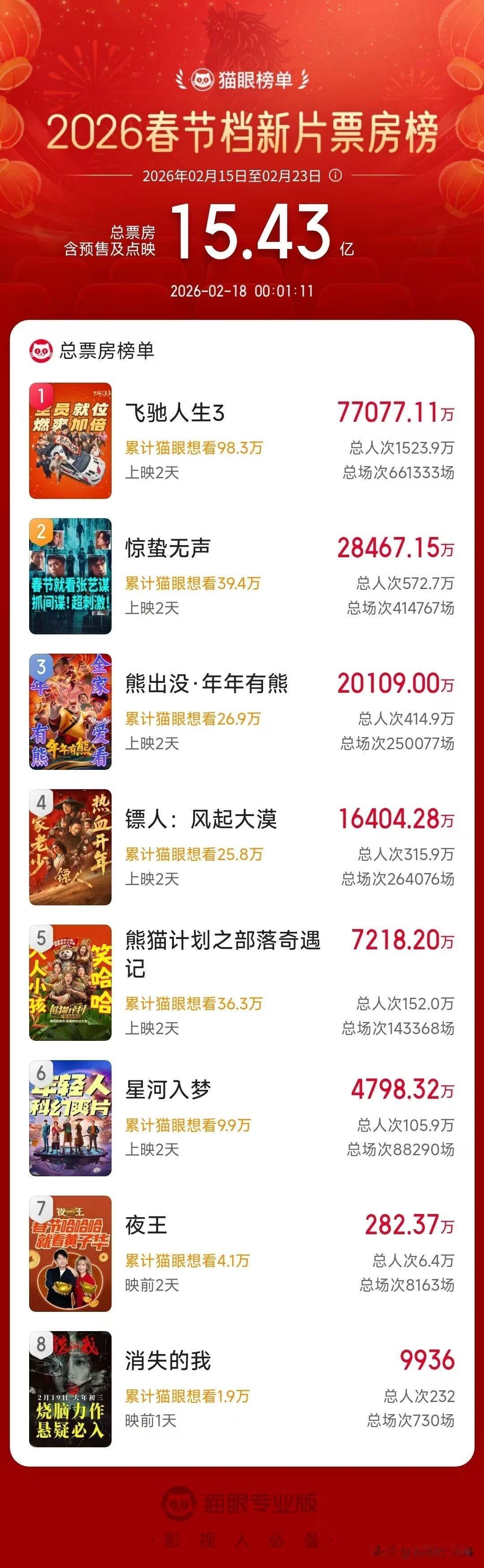 截至18日0点,2026春节档总票房(含预售)超15亿元,大年初一单日票房12.66亿元超预期收官。 ▶️ 票房榜:《飞驰人生3》7.7亿领跑,《惊蛰无声》2.8亿第二,《熊出没·年年有熊》《镖人:风起大漠》均破亿。 ▶️ 新纪录:大年初一总场次超57万场,刷新影史初一单日场次纪录。 这势头,今年春节档大概率要改写纪录了![烟花][烟花][烟花]