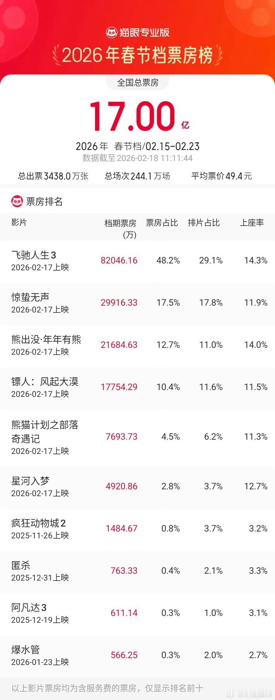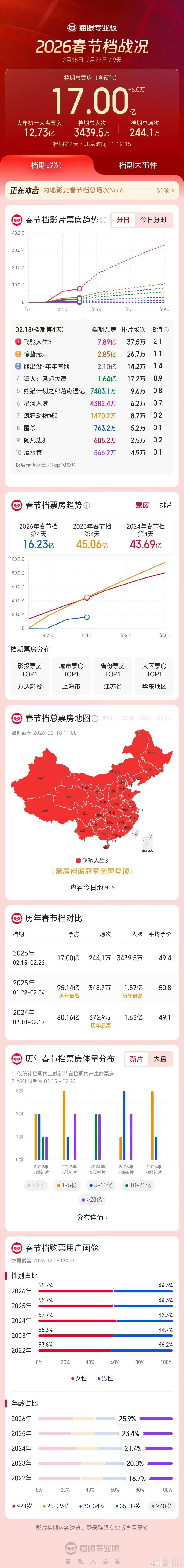 2026春节档票房破17亿 据猫眼专业版数据,2026年春节档档期总票房(含预售)破17亿,《飞驰人生3》《惊蛰无声》《熊出没·年年有熊》分列前三位。