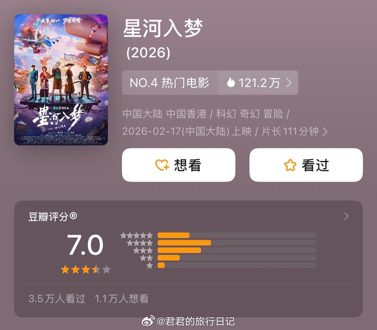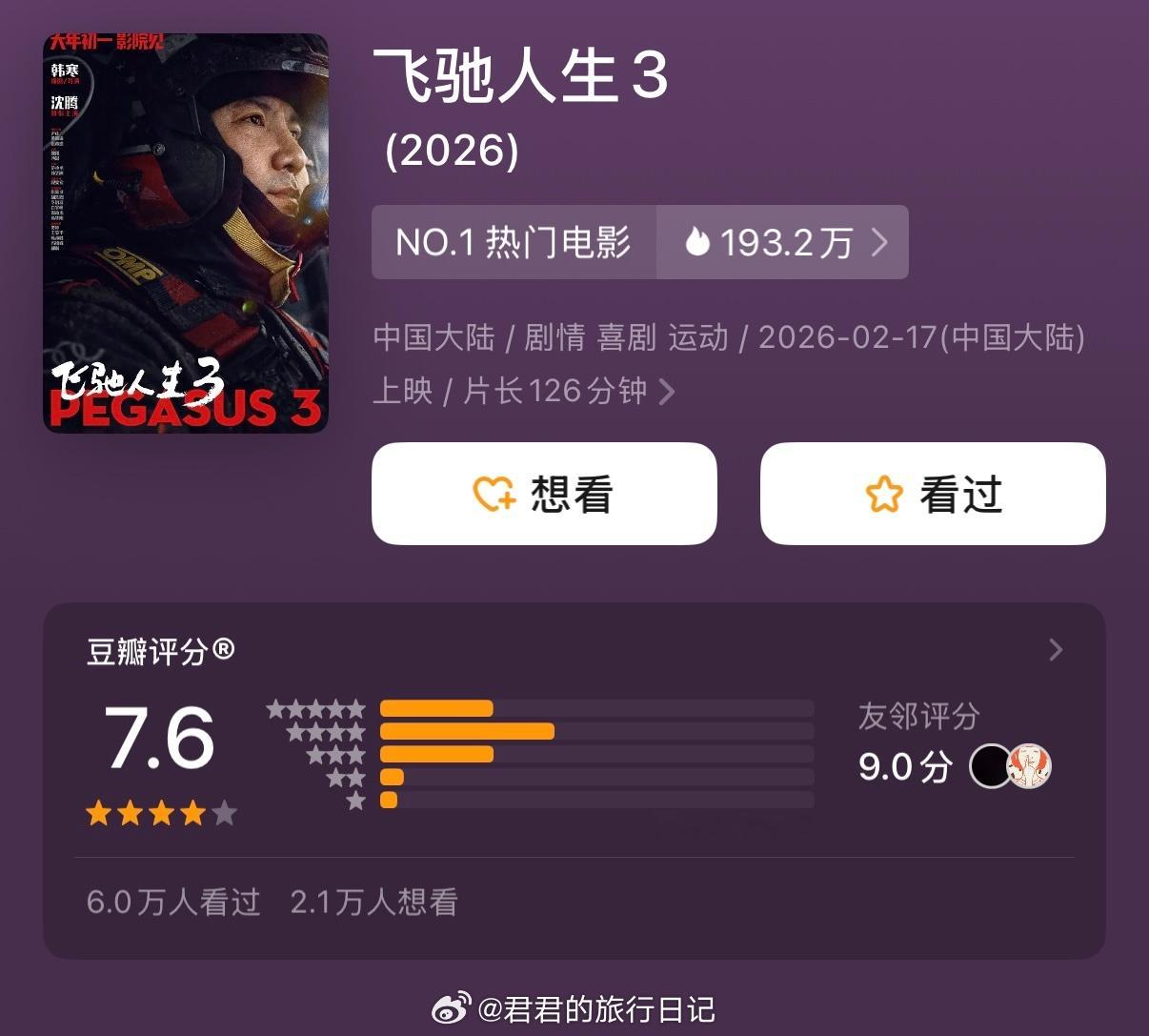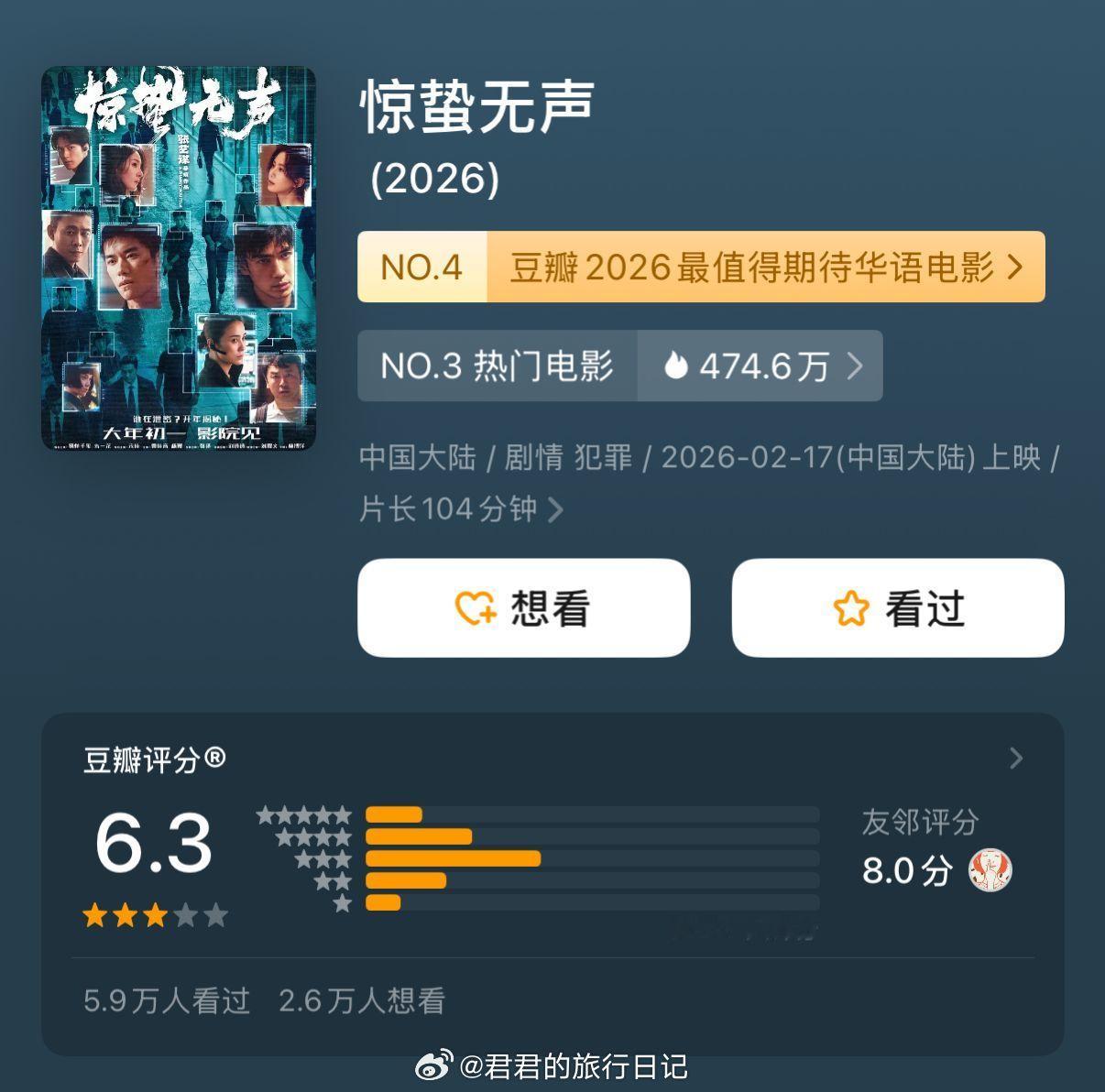 今年春节档目前四部豆瓣开分了!你看了哪一部?《飞驰人生3》 7.6《镖人》 7.5《星河入梦》 7.0《惊蛰无声》 6.3