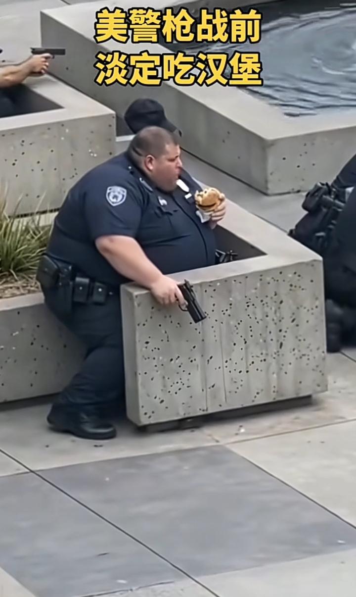 美国执法人员在狙击对手是淡定吃汉堡,看其吨位应该是一个喜爱美食的人,不明白他是如