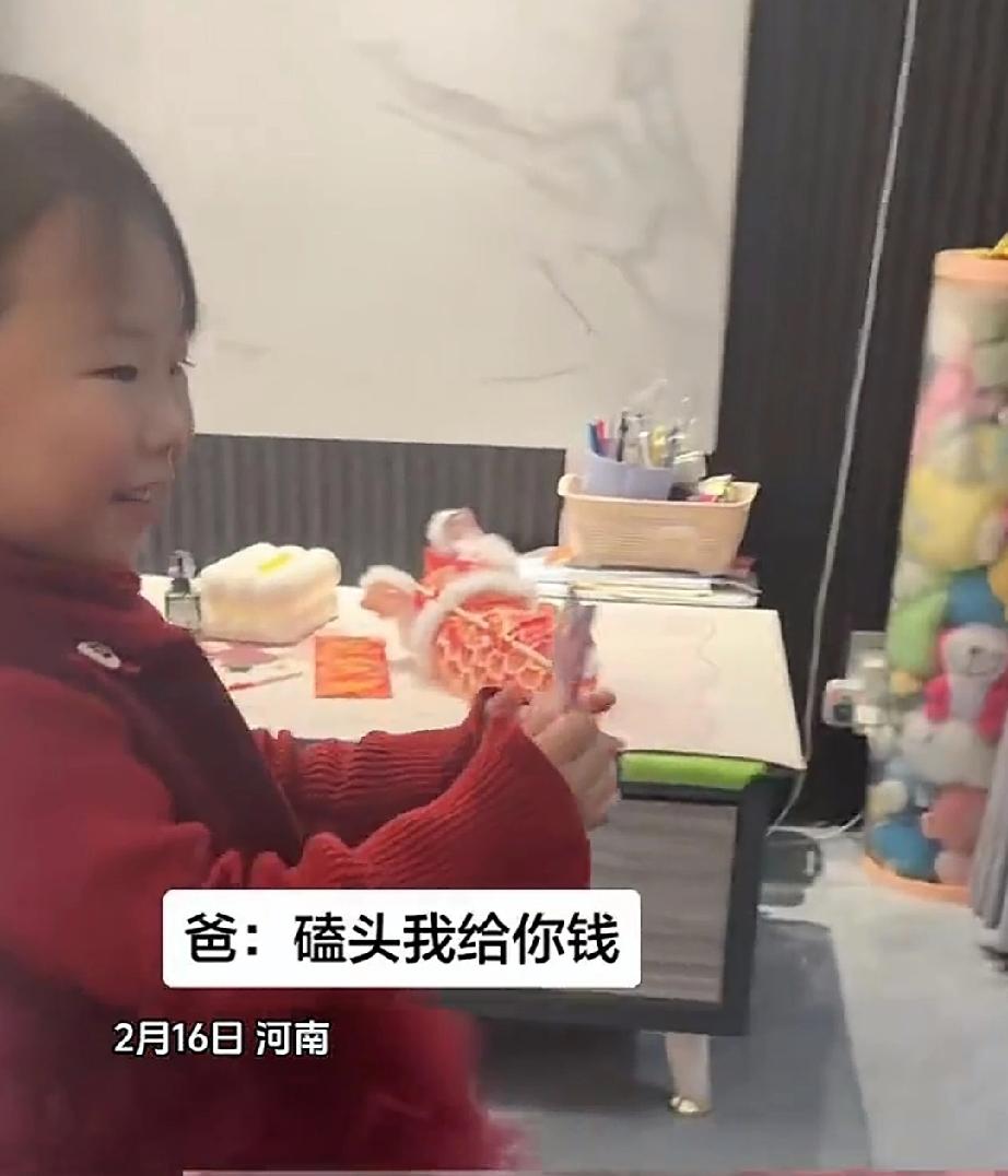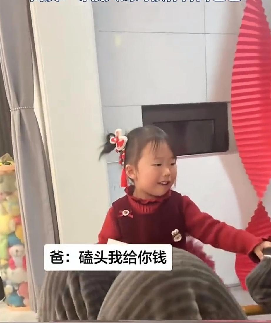 2月16日除夕夜,河南。爸爸让女儿给自己磕头拜年。女儿不懂这是什么意思,就按照爸爸的吩咐做了。爸爸给了女儿钱。 爸爸平时带女儿,总爱和她做游戏。女儿懵懵懂懂,觉得好玩,拿钱可以叫人磕头。以为这是一种游戏,她想与爸爸换个角色做游戏,自己出钱,让爸爸磕头。她攥着爸爸刚给的钱。摇着爸爸,撒娇的说:爸,磕头我给你钱。 女儿还小,不明事理,做父母的不要放过机会,进行教育。磕头拜年,是中国的传统文化,表示对长辈的敬畏、感恩。长辈给孩子的钱,叫压岁钱。表示长辈对晚辈的关爱和祝福。这可不是游戏,不能乱来。 女儿拿着刚收到的红包让爸爸磕头 父女俩 教育孩子
