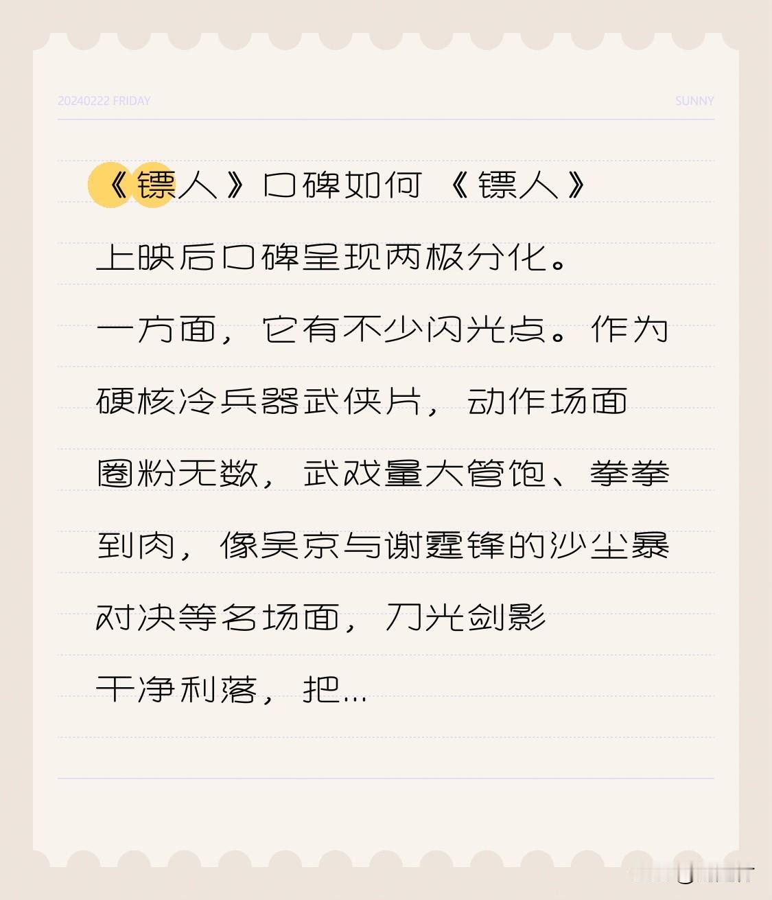 《镖人》口碑如何 《镖人》口碑如何?上映后,其口碑呈现两极分化态势。 一方面,它亮点颇多。作为硬核冷兵器武侠片,动作场面圈粉无数。武戏丰富精彩,拳拳到肉,如吴京与谢霆锋的沙尘暴对决等名场面,刀光剑影干净利落,将中式武侠的凌厉与狂野展现得淋漓尽致。大漠实景拍摄、高还原度的服化道,带来顶级视觉体验。吴京饰演的刀马侠气与痞气兼具,让武侠迷找回当年看武侠片的爽感。 但另一方面,槽点也不少。文戏偏弱、剧情节奏混乱,多线叙事仓促,人物动机交代不清,部分角色塑造扁平。年轻演员台词功底遭吐槽,部分配音出戏,拉低了文戏质感。此外,影片选在寒假+春节档上映,暗黑、残酷的风格与节日氛围不符,也不适合带孩子观看。