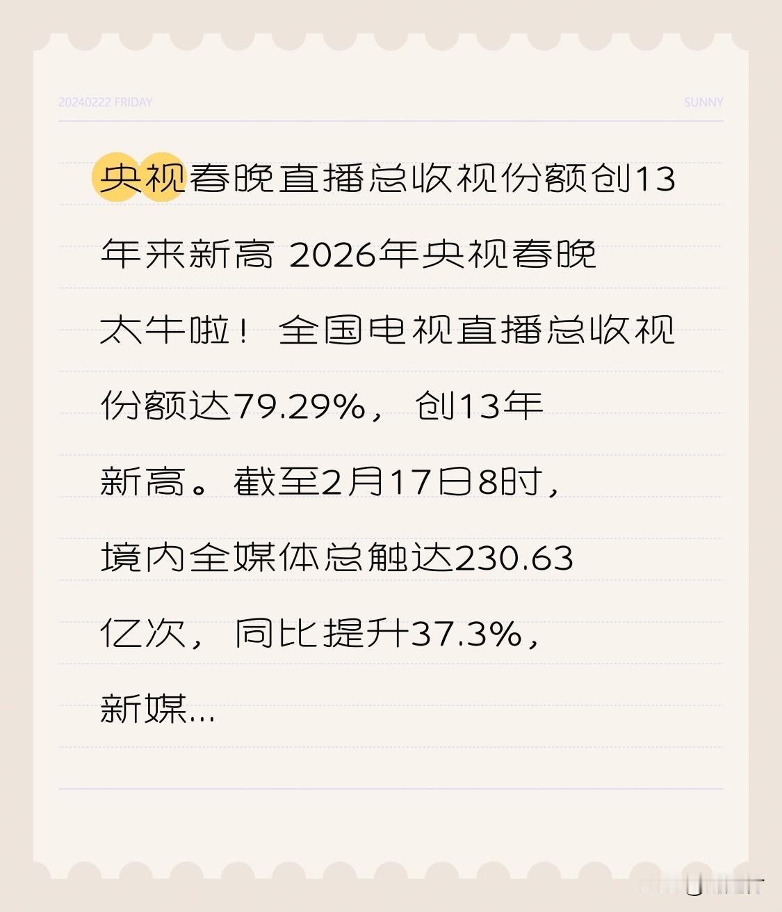央视春晚直播总收视份额创13年来新高 2026年央视春晚太牛了!其直播总收视份额创13年来新高,全国电视直播总收视份额达79.29%。截至2月17日8时,境内全媒体总触达230.63亿次,同比提升37.3%;新媒体端直点播触达总数为162.07亿次,同比增长49%。播出时平均每分钟3.25亿人同时在线,峰值破4亿。 此外,网络热度持续攀升,近2000个话题登上热搜热榜,全网话题阅读量达271.2亿次。年轻用户占比达41.82%,关联新质生产力内容关注占比提升5.4倍。这一成绩不仅体现观众对节目内容的认可,也表明春晚在新媒体时代成功破圈,让春节文化传播更上一层楼!