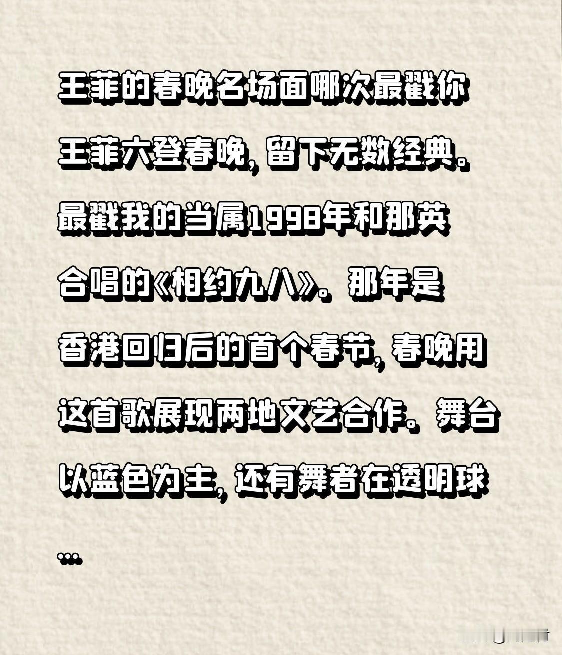 王菲的春晚名场面哪次最戳你 王菲的春晚名场面,哪次最打动你?王菲六登春晚,留下无数经典,最打动我的是1998年她和那英合唱的《相约九八》。那年是香港回归后的首个春节,春晚用这首歌展现两地文艺合作。舞台以蓝色为主,还有舞者在透明球里伴舞,梦幻感十足。那英嗓音浑厚,王菲空灵悠远,两种嗓音融合,让歌曲既有踏实的幸福,又有悠长的回味。王菲当时的“晒伤妆”搭配“双丸子头”,时尚独特,成为千禧年的靓丽风景。直至如今,这首歌依旧广为传唱,每次听到都能把人带回那个充满希望的年代。