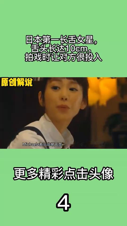 日本第一长舌女星,舌头长达10cm,拍戏时让对方很投入。 她当场傻眼甚至想要骂人。拍戏后她询问男演员为何舌吻,男演员的回答却是因为女方舌头太长伸到了自己嘴里,让自己误以为女方主动出击,于是便热情的回应着。Michaela表示非常无奈,从此再也不敢拍吻戏了。这种尴尬的场景她不想再次体验,难道舌头长也有错嘛? 之前舌尖舔鼻头的挑战火了,大家纷纷跟风模仿,却很少有人能够完成挑战,然而Michaela轻而易举的完成挑战。Michaela从出生以来舌头就与众不同。