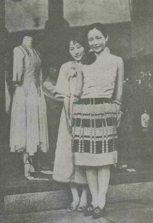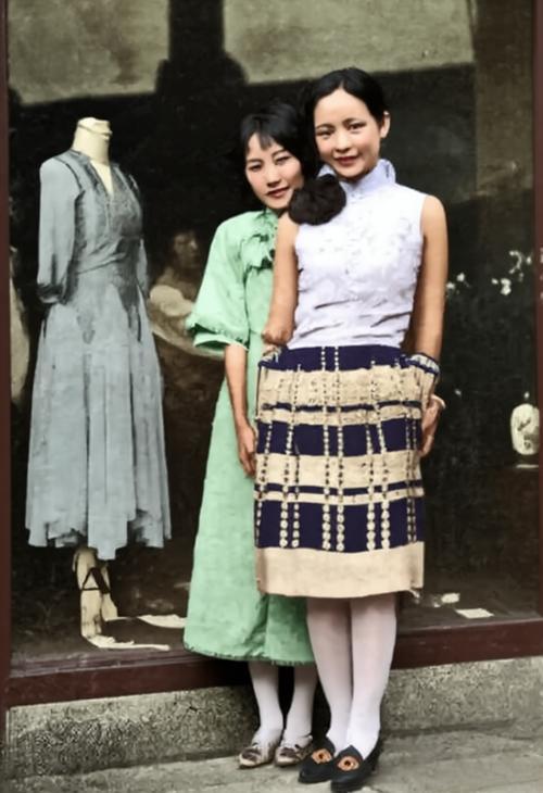 这张老照片是民国时期上海时尚界的珍贵影像,定格了唐瑛(右)与陆小曼(左)两位名媛,在她们参与创办的“雲裳”时装店门前的瞬间。 照片拍摄于上海“雲裳”时装店门前,左侧橱窗中的人体模特身着西式连衣裙,店内陈设尽显时尚气息。“雲裳”是20世纪30年代上海最具影响力的时装店之一,主打中西合璧的服饰设计,引领了当时的时尚潮流。