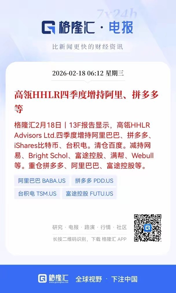 高瓴HHLR四季度调仓:押注电商与硬科技,清仓百度释放关键信号2月18日,高瓴旗下HHLR Advisors披露四季度13F报告,再度成为市场风向标。这份持仓变动,既是顶级机构对2026年的前瞻判断,也是一套清晰的赛道取舍与风控路线图。增持端:聚焦确定性,电商+硬科技双线加码阿里、拼多多获持续加仓,延续三季度趋势,体现对消费复苏、电商格局优化与跨境、直播等新增长引擎的信心。同时高瓴增持台积电与比特币信托,一边押注半导体产业链复苏,一边在另类资产中分散配置、捕捉新机遇。减持与清仓:果断断舍离,退出低效资产高瓴直接清仓百度,并减持网易、富途、满帮、Webull等标的,反映对互联网流量红利见顶、部分赛道竞争加剧、商业化兑现不及预期的谨慎态度。百度被清仓,核心指向市场对其AI大模型商业化进度与盈利确定性的担忧。整体逻辑:收缩战线、集中重仓调仓后拼多多、阿里仍居前列,意味着高瓴并未放弃中概互联网,而是从全面布局转向极致精选。整体思路非常明确:拥抱现金流与增长确定性更强的核心资产,对兑现缓慢、竞争恶化的标的坚决退出。对市场的启示对A股、港股而言,电商、半导体等具备全球竞争力的龙头,更易获得长线资金青睐;缺乏核心壁垒、依赖流量红利的公司,或将持续承受估值压力。高瓴这轮操作,本质是在不确定性中抓确定,也是当前机构配置的主流思路。