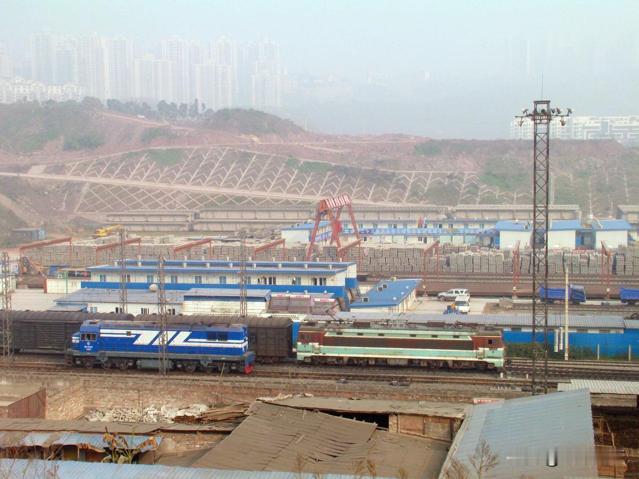 2013年2月,重庆北站西端外边,一列渝怀线的货运列车与重庆北站的调车机车,旁边当时是渝利铁路以及兰渝铁路的铺架基地,渝利和兰渝接的是现在重庆北站的北场,只是兰渝铁路渭沱到重庆北站北场这段建成后算入沪蓉线,图中渝怀线的货运列车在2014年夏季开始改走货车外绕线,不再从重庆北站经过,这也减轻了重庆北站的行车压力。