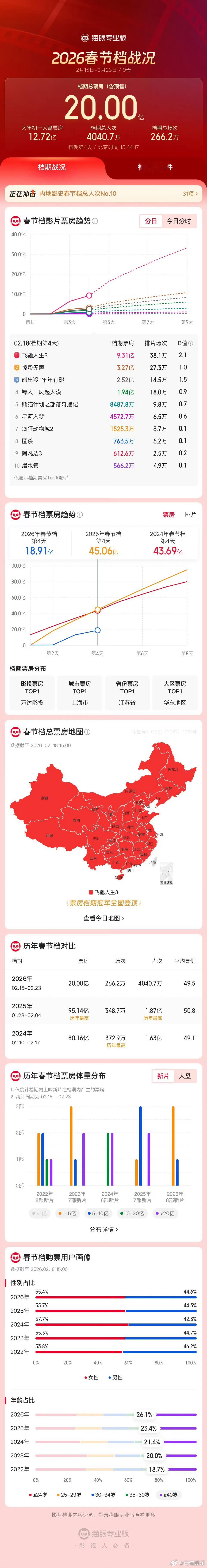 2026年春节档总票房破20亿 据猫眼专业版数据,2026年春节档档期总票房(含预售)破20亿,《飞驰人生3》《惊蛰无声》《熊出没·年年有熊》分列前三位。