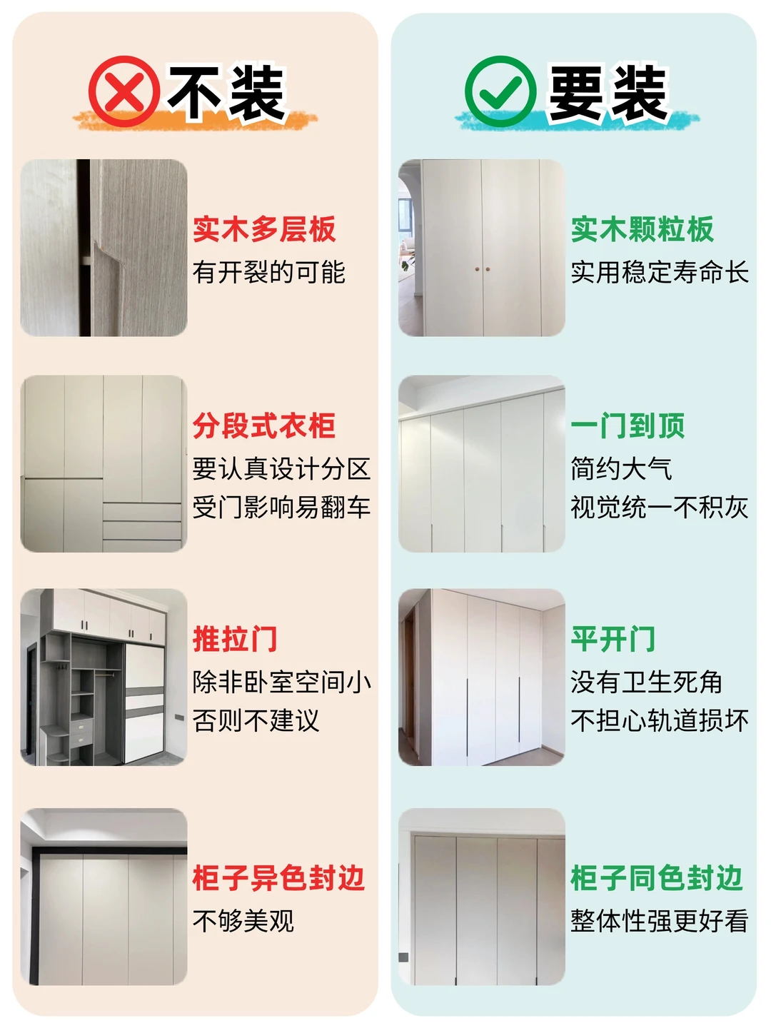 ⚠️全屋定制中衣柜是重中之重,一定要牢记这20个避坑细节,特别是尺寸,否则只会越用越揪心!建议码住不踩坑~ ✅衣柜内部区域设计: 一、分为挂衣区、叠放区、抽屉区、裤抽区、换季被褥区 二、1.85m以上空间(拿取不易、低频率收纳区)设计为换季被褥区 三、0.65-1.85m之间(无需弯腰、高频率使用区)设计挂衣区和叠放区放当季衣物 四、低于0.65m空间设计抽屉放内衣袜子等 五、 0.9-1m高度可设计抽拉裤架 六、 衣柜整体深度建议55-65cm ✅常见衣柜:【平开门】or【推拉门】 👉除非卧室空间特别小,否则不建议推拉门,推拉门的轨道容易坏,也容易积灰,不好打扫 ⭕️【平开门】尺寸 🔹柜门的宽度40cm左右,视觉效果好 🔹柜门到床的距离大于60cm,不影响开柜门 🔹柜子底板外置高度5-8cm,开关柜门不磕碰脚 🔹短衣区高度90-100cm 🔹长衣区高度140-150cm 🔹裤架高度80-85cm 🔹抽屉高度15-20cm 🔹衣柜深度55-60cm 🔹做少量叠衣区高度35-45cm 🔹挂衣杆到层板的距离5-6cm ⭕️【推拉门】 🔸每扇门宽度70-100cm,但不建议做太宽 🔸顶柜高度50-60cm 🔸下柜高度低于210cm 🔸衣柜深度60-65cm,这个尺寸要考虑滑轨的占用空间