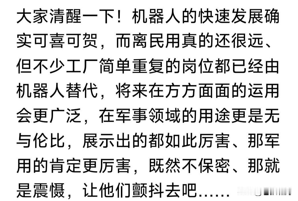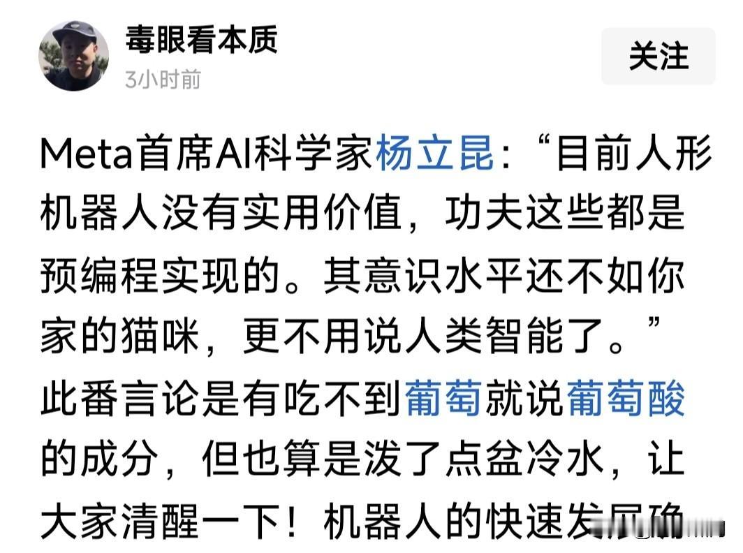 央视春晚机器人大放异彩!令人十分惊讶振奋。但也听到有专家泼冷水,比如MetaAI科学首席科学家杨立坤。 他说:目前人形机器人无实用价值,功夫都是预编程序。其意识水平还不如你家的猫咪,就更扯不上人类智能! 苍狼对杨立坤观点,有以下几点看法: 1.央视春晚展现的机器人表演,确实让人眼前一亮,感受中国科技巨大进步!但这不是我们独有,发达国家都有。 2.人形机器人确是计算机预编程序,与人的大脑意识相差甚远!不如“猫咪意识”是事实,不是真正的“人类智能”。 3.功夫机器人也是如此,由输入预编程序控制,用于表演可以。目前用于实战肯定不行,要被打得“晕头转向”吧? 4.至于“人形机器人”无实用价值?原因有二:一是价格昂贵,常人买不起;二是智能低下,没有人类全部功能。但在规定程序领域,已经大量运用。比如机器组装,医疗手术,快递分发等。 5.也有例外情况!据悉就有围棋机器人战胜顶尖围棋选手!但这依赖于输入所有围棋比赛案例,再顶尖的选手也会考虑不周失误,但机器人却不会有。 6.目前阶段,机器人智能与人类相差甚远,只能靠人输入程序,为人类服务。但也不排除未来超越人类智能,不听人类指令!果如此就是人类灾难了! …………