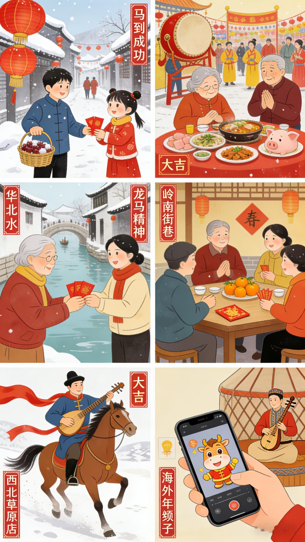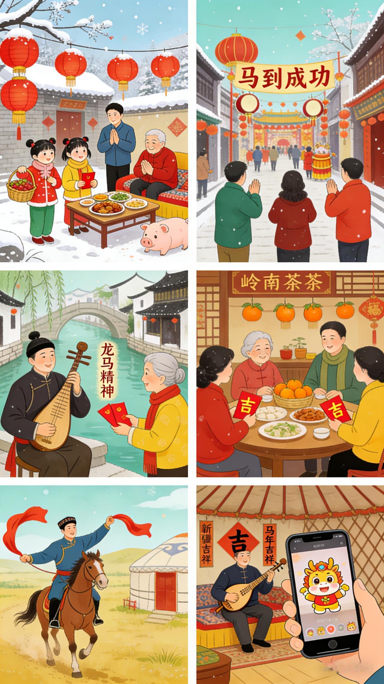 2026马年正月,神州大地年味浓溢,天南地北的拜年习俗,织就一幅多彩的团圆画卷。 东北雪乡,红灯笼映着白雪,小伙姑娘提着冻梨拜年,长辈发红包,炕头杀猪菜暖透寒冬。华北街巷,人们抱拳作揖,一句“马到成功”,伴着庙会锣鼓声传向远方。 江南水乡,评弹声里,长辈递上红包,软糯吴语道尽“龙马精神”。岭南早茶店,亲友围坐,互赠年桔讨“大吉”彩头,利是封里藏着满满祝福。 西北草原,汉子策马挥红绸,新疆毡房里冬不拉弹起祝福歌。如今,视频连线让海外游子“归”家拜年,马年表情包成为年轻人的新潮祝福。形式虽异,那份盼团圆、祈安康的初心,让五湖四海连成温暖的家。