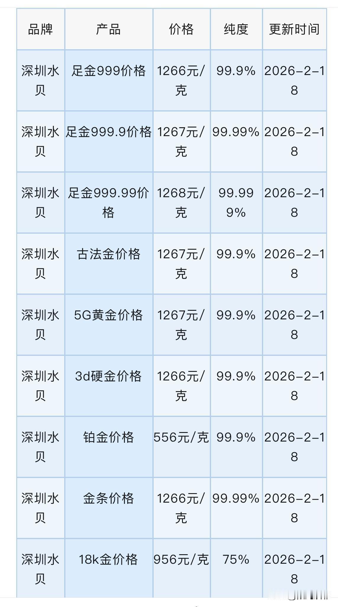 今日大年初二!(2026年2月18日-19点40)深圳水贝黄金、铂金批发报价!以及水贝购买黄金饰品的一些方法与贵金属分析要点! 那么来看看,今天深圳水贝黄金铂金批发报价为多少钱一克了? 水贝足金999价格1266元/克,水贝古法金价格1267元/克,水贝铂金价格556元/克/克,水贝金条价格1266元/克,水贝18k金价格956元/克。 同昨天(2月17日)深圳水贝黄金、铂金批发报价相比较,今天深圳晚上水贝黄金、铂金批发价格都整体下跌了。 足金3个9、4个9、5个9、金条、5G黄金、3d硬金批发价格各分别下跌了15元/克,18k金批发价格下跌了11元/克,铂金批发价格下跌了1元/克。 根据2026年02月18日 黄金实时价格行情,深圳水贝今日金价等于1266 元/克。水贝黄金回收今日价格等于1050元/克。 根据黄金价格网消息: 北京时间2026年2月18日(周三),在逢低买盘的支撑下,黄金白银价格触底反弹上涨,现货黄金重新回到4900美元/盎司上方,现货白银重新回到75美元/盎司上方,铂金及钯金价格同步上涨。 当前市场的焦点是即将公布的美联储会议纪要,以寻找未来利率路径线索,直接影响美元走势,进而决定黄金短期方向。 分析师表示:如果美联储会议纪要释放偏鸽信号,美元再度走软,从而支撑黄金价格上涨,若偏谨慎或偏鹰,从而对黄金上涨构成压力。 技术方面,如果金价跌破4830美元支撑位,则可能引发进一步回调,关注4800美元关口。 如果金价重新站稳4900美元上方,则有望恢复涨势! 来分享个选购黄金三技巧: 1,那么怎么选黄金呢? 首先黄金不需要选品牌,因为黄金的纯度一样,只是品牌溢价导致价格有所不同,建议哪家合适买哪家,尽量不要选一口价金饰,折算下来每克单价太高,建议按克购买最划算。 2,如何判断我买的黄金是否是纯金? 直接看内壁的钢印,3个9和4个9代表黄金的纯度,足金上面印有AU 999、G999和足金999的字样,如果只有999,你真的要当心。 3,那3D 5G古法金是真的黄金吗?这里有什么区别? 3D 、5G和普通黄金都是真黄金,只是工艺不同,加工过后硬度更高,不容易变形。古法黄金是纯手工制作,工艺性更强。 再来分享个散客怎么足水贝购买黄金呢? 1、金展珠宝广场负一楼,柜台很多,黄金款式多,适合散客逛购买,不过人多拥挤。 2、水贝国际、金座、壹号、银座、特力等是贯通的,这里除了黄金还有铂金、钻石、翡翠、珍珠等,人没有那么拥挤。 另外,要申明一下,水贝是全国最大的黄金批发市场,批发价格是国际金价+手工费(不同的工艺,工艺费不一样)。 所有信息,都只是提供参考价值! 购买黄金有风险,投资需要谨慎,不要盲目跟风! 水贝黄金暴雷 深圳水贝首饰 深圳黄金按克卖 水贝黄金工费 黄金足金水贝 上海水贝黄金 水贝足金首饰