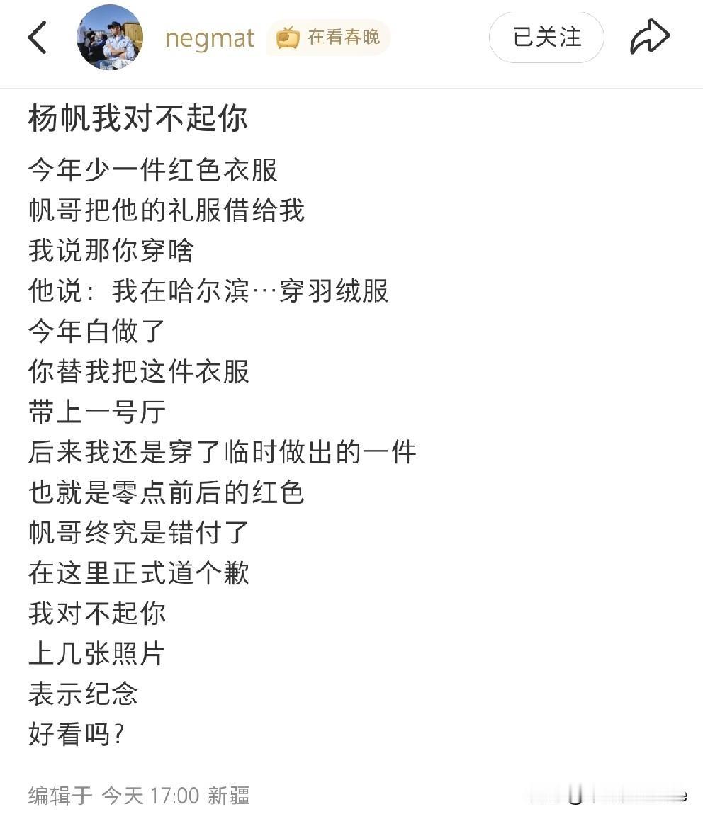 2月 18日,央视主持人尼格买提更新春晚趣事,并配文“杨帆,我对不起你”。 尼格买提因为少准备一件红色西装,杨帆就把他定制的西服给了小尼哥。 结果尼格买提最后还是穿了临时制作的衣服,杨帆终究是错付了。 虽然杨帆的主持能力不错,但他去年依旧没能登上央视春晚北京主会场,着实有点可惜。 小尼哥为了弥补遗憾,他特地把杨帆哥的红色西装穿起来,拍了4张单人照,整个人看起来非常帅气,大家觉得呢?