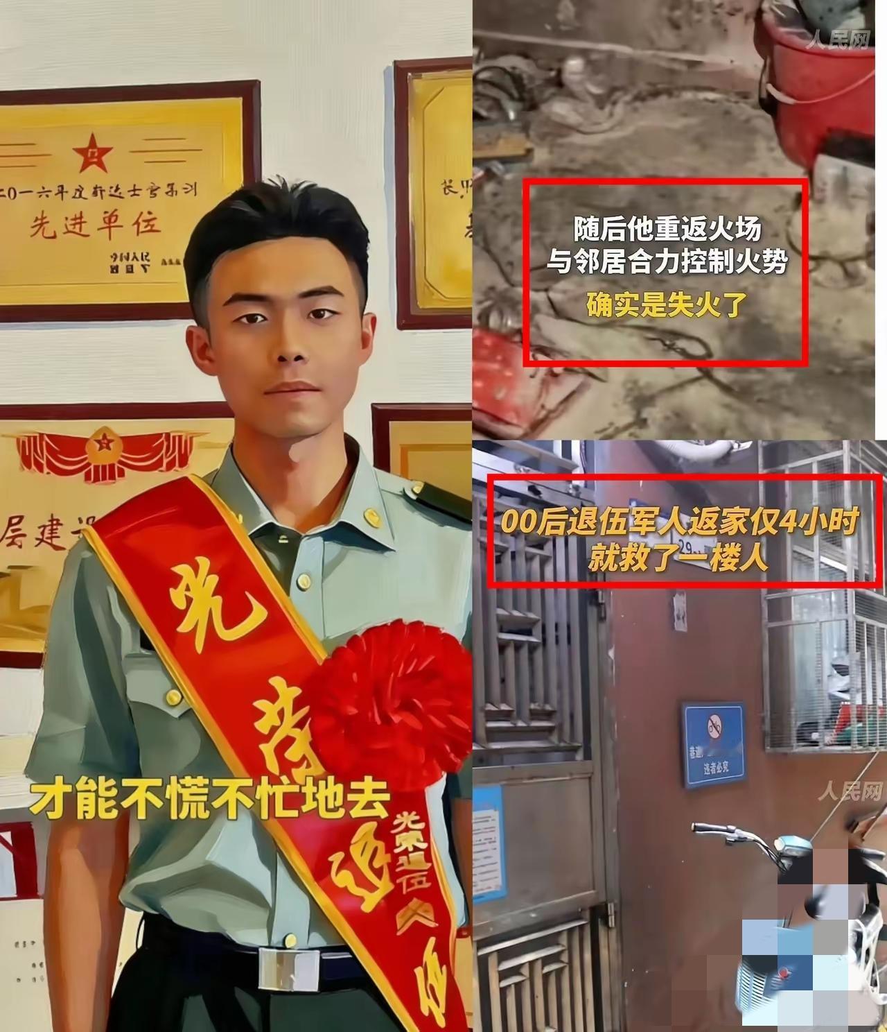 才退伍4小时!23岁的王謇睿,用行动诠释了什么叫刻在骨子里的担当。 刚到家连行李箱都没收拾,妈妈的饺子还没吃上,一股焦糊味瞬间唤醒了他的军人本能。面对突发大火,他没有逃生,而是冷静报警、逆着人流冲上高楼,挨家挨户拍门,把39户98位邻居全部安全唤醒。 断电、疏散、灭火,一套动作行云流水,这不是运气,是部队锤炼出的责任与本能。军装可以脱下,为民冲锋的底色永远不会褪色。 真正的英雄,从不需要刻意标榜,危难时刻挺身而出,就是最耀眼的模样。 你被这位退伍小伙的举动感动到了吗?来评论区为他点赞~ 军人本色