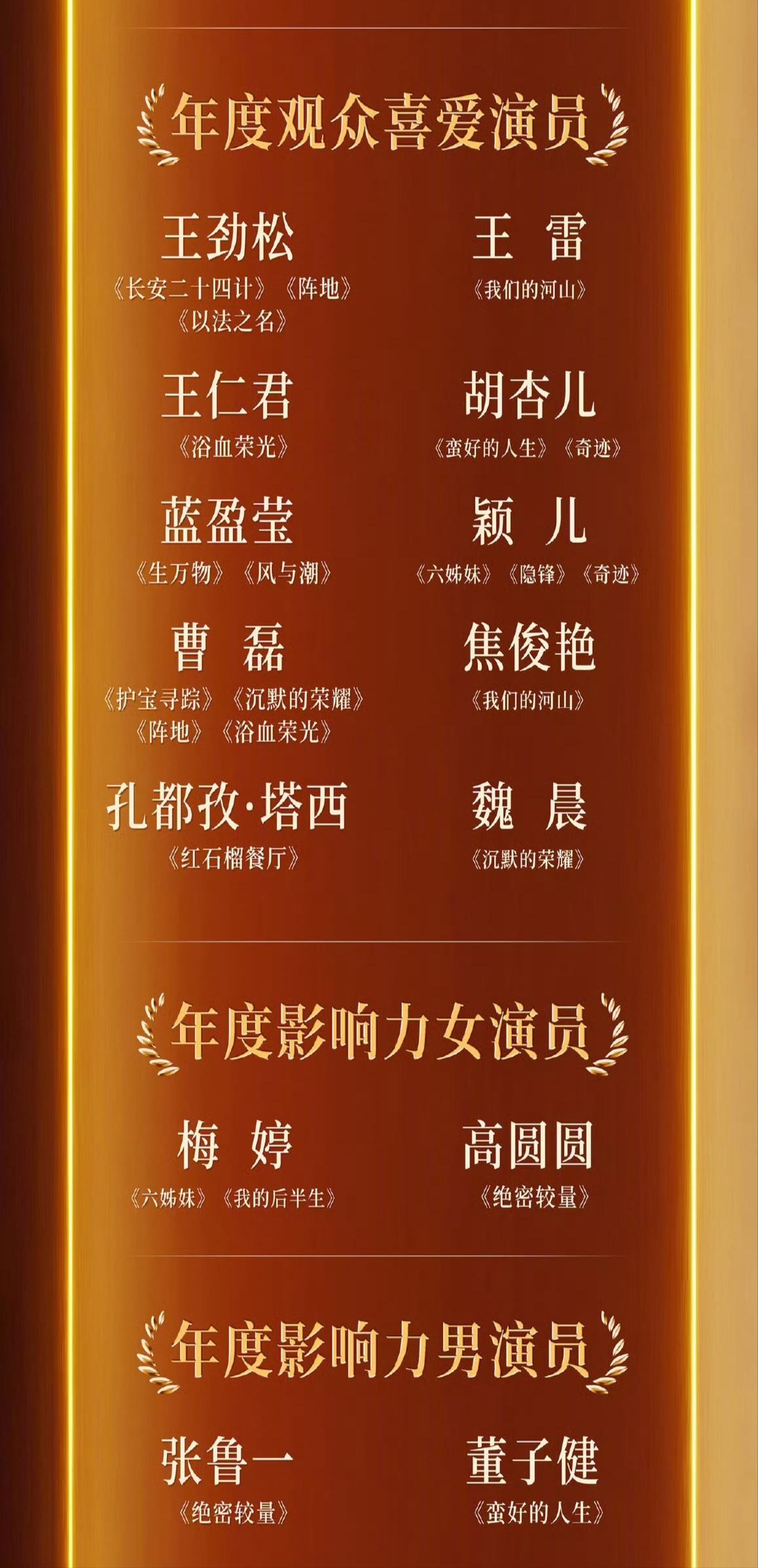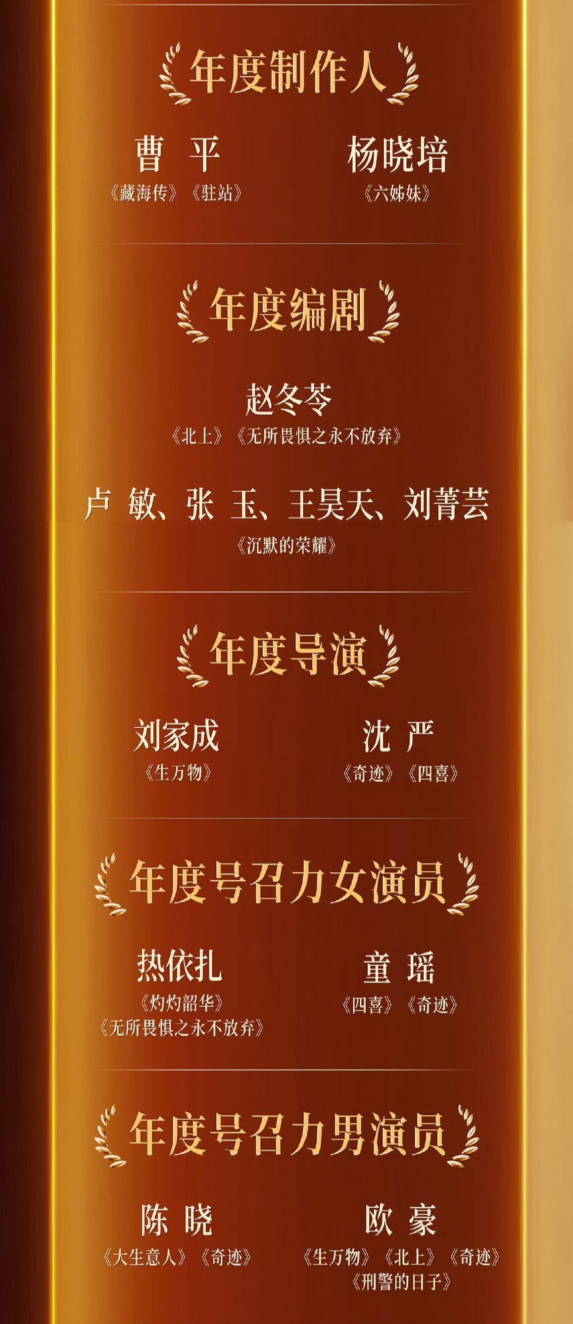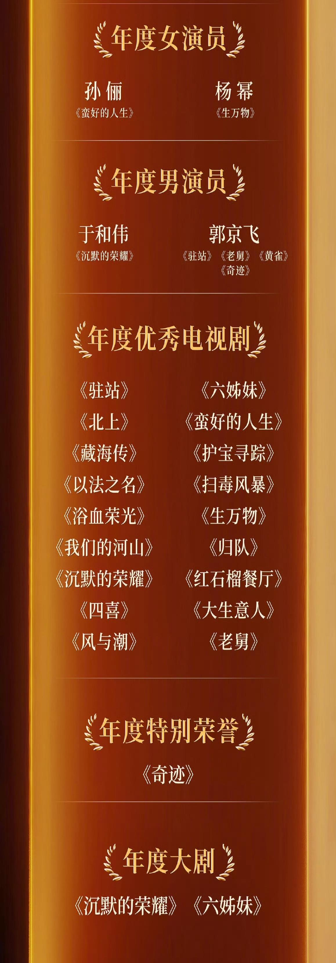 看完第四届中国电视剧年度盛典,真替迟蓬和吴越不值! 个人觉得,最有争议的两个奖项归属是年度实力女演员和年度女演员。 1. 年度实力女演员颁给了王佳佳和齐欢。 “老舅妈”王佳佳实至名归,演技好又有味道,早该获奖了!看到她激动落泪的样子,真替她高兴! 齐欢在《北上》确实演的不错,但相比获得全网一致好评的“大脚娘”迟蓬还是差点火候。个人觉得,年度实力演员颁给迟蓬和王佳佳更合适。 2. 年度女演员颁给了孙俪和杨幂。 “娘娘”在《在蛮好的人生》里的表演我是服气的,预感她今年很有可能第三次捧回白玉兰奖视后奖杯。 再说杨幂,她在《生万物》确实突破很大,但是是跟自己比,离视后还有距离。 更更何况一同入围的还有《沉默的荣耀》的吴越、《无尽的尽头》的任素汐。大家觉得,杨幂比她们强吗? 不过,中国电视剧年度盛典只是表彰在央视播出的电视剧的小奖。期待迟蓬在今年的三大奖中有所斩获! 最后放上完整获奖名单(图2-图6)。谁的获奖或落选最让你意外呢?欢迎评论区唠唠~