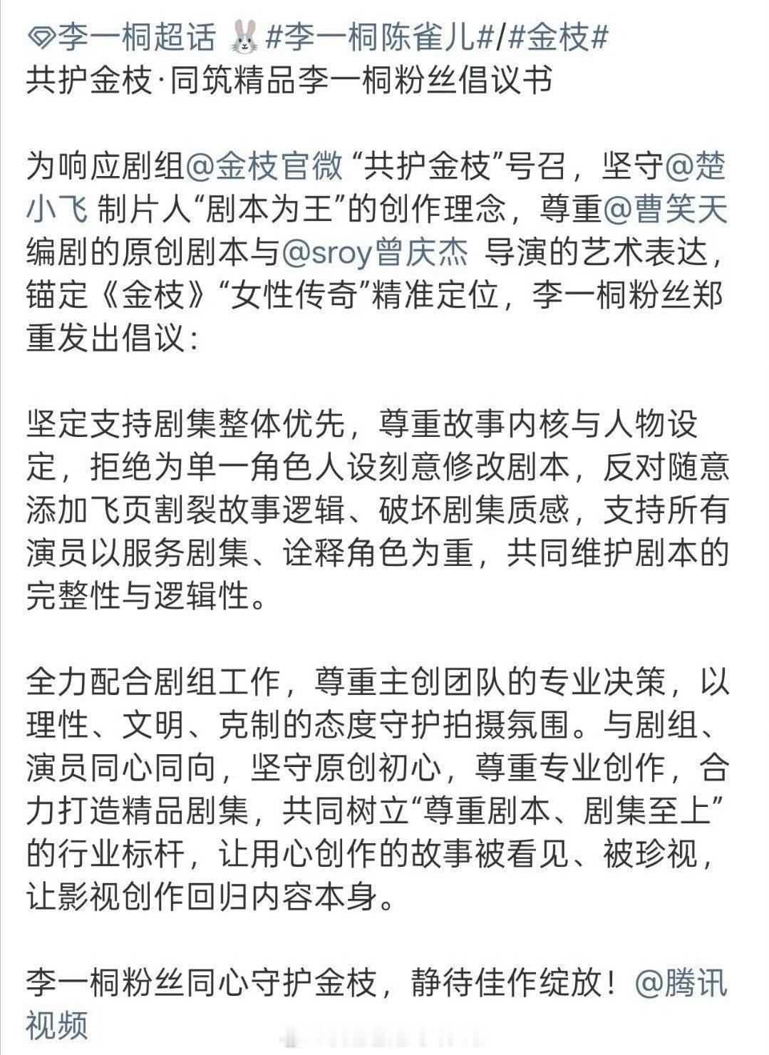 李一桐、陈星旭双方粉丝给《金枝》剧组的倡议书,女主粉丝拒绝飞页加戏,男主粉丝拒