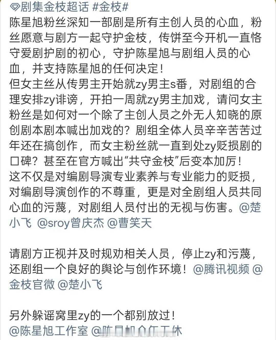 李一桐、陈星旭双方粉丝给《金枝》剧组的倡议书 ,女主粉丝拒绝飞页加戏,男主粉丝拒绝zy黑稿