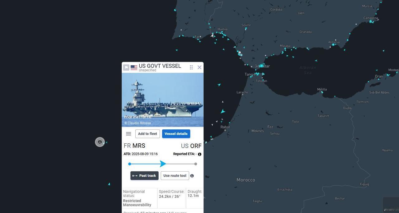 突发新闻——美国海军“杰拉尔德·R·福特”号航母在摩洛哥海岸附近被发现。