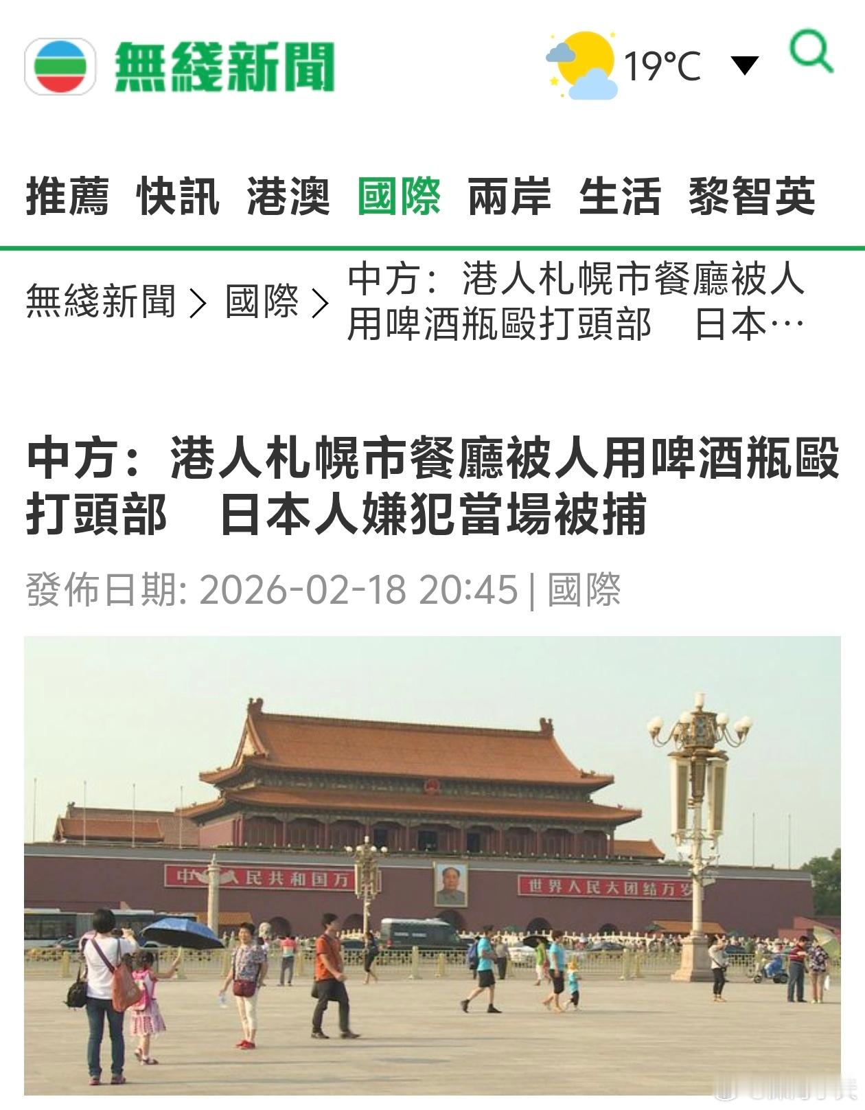 中国香港居民在北海道遇袭一名香港游客凌晨在北海道札幌市内餐厅,被人用啤酒瓶殴打头部,警方当场逮捕日本人疑犯。中国驻札幌总领馆已向当地警方提出交涉,要求警方依法严肃追究加害者责任,切实维护中国公民安全与合法权益。总领馆再次提醒中国公民近期避免前往日本,并提醒中国公民密切关注当地治安形势,提高安全防范意识。中领馆再提醒避免前往日本