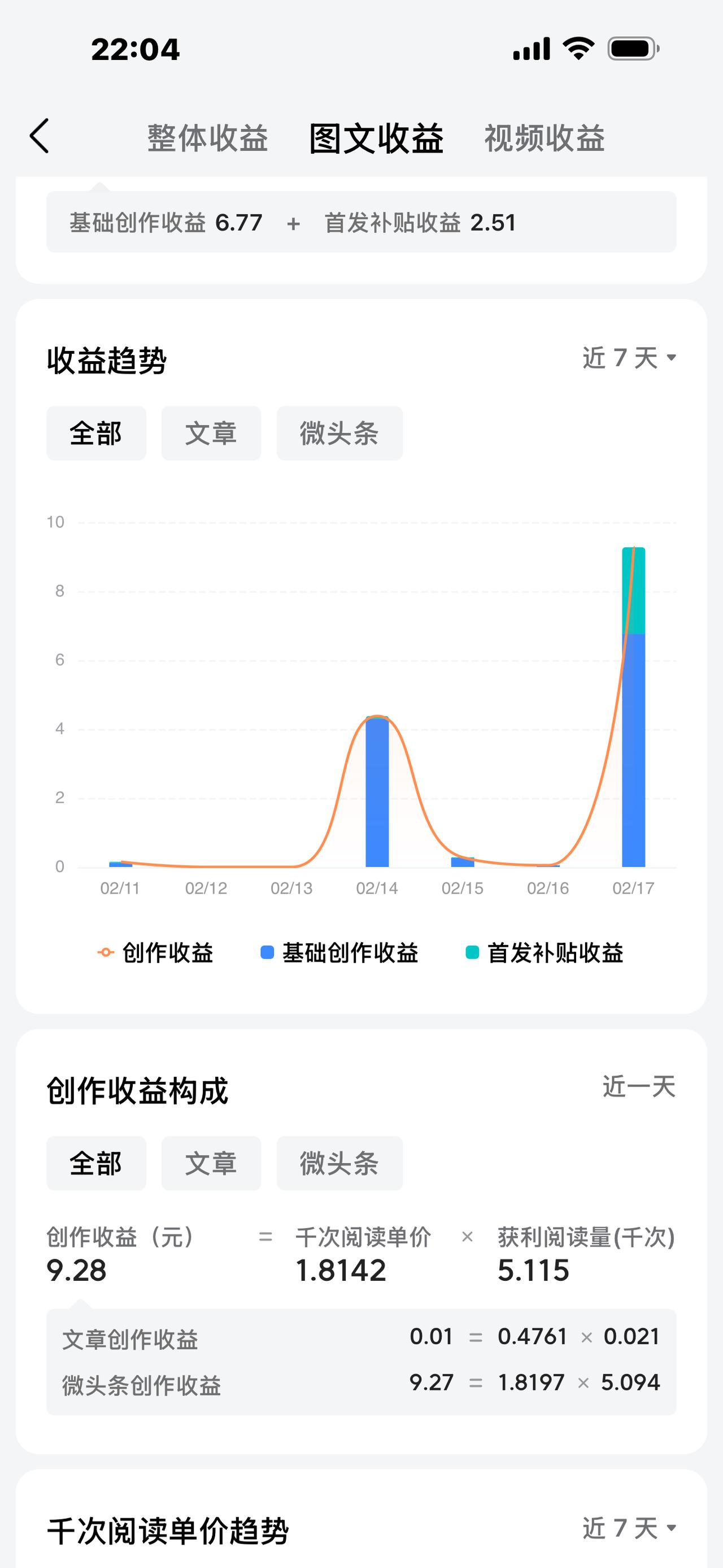 忙碌了一天,终于到了晚上休息的时间,这也是一天里我觉得最惬意的时光,那就是躺在床上刷手机。 今天,当我看到自己的创作收益时,都有点惊讶,因为除了征文,我都记不清自己有多久没有这么高的单价和收益了。 今天的收益居然有9.28元,6.77元创作收益➕2.51元首发补贴,单价也有了1.8142/千字,看样子还是不能偷懒,得多写。