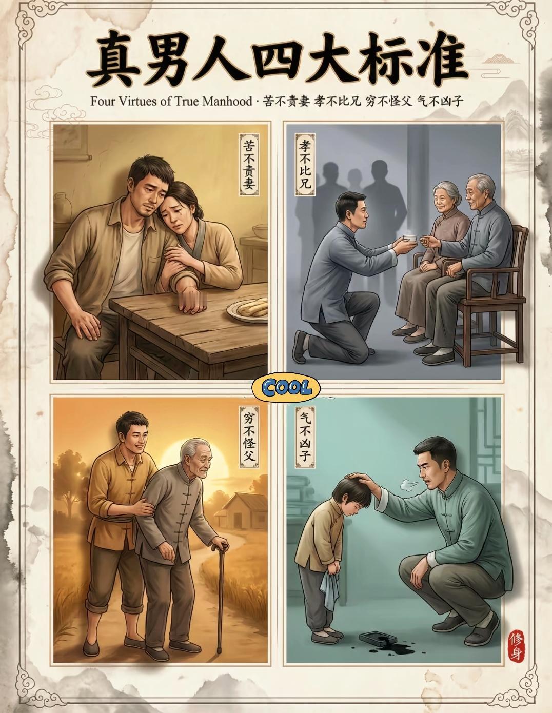 真男人: 苦不责妻 穷不怪父 孝不比兄 气不凶子 方为大丈夫