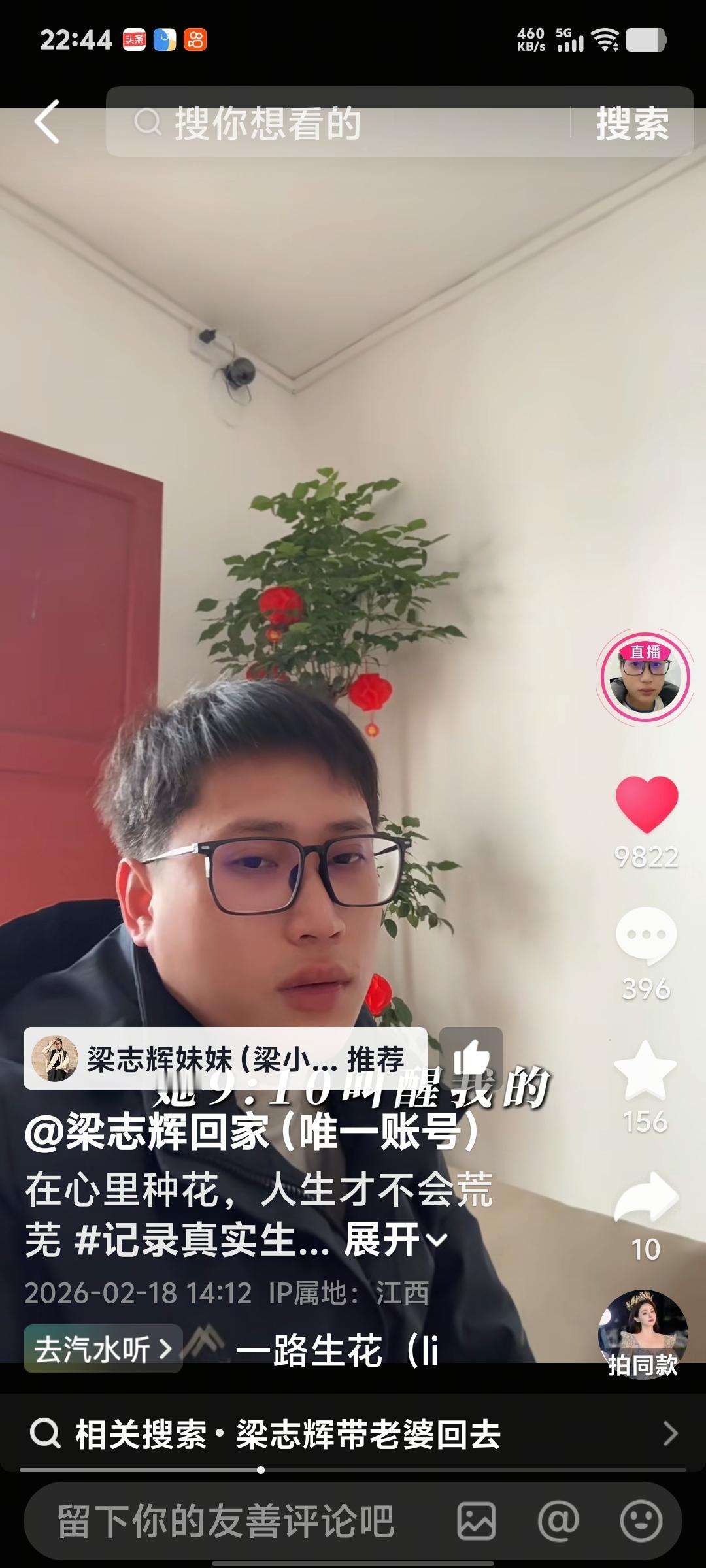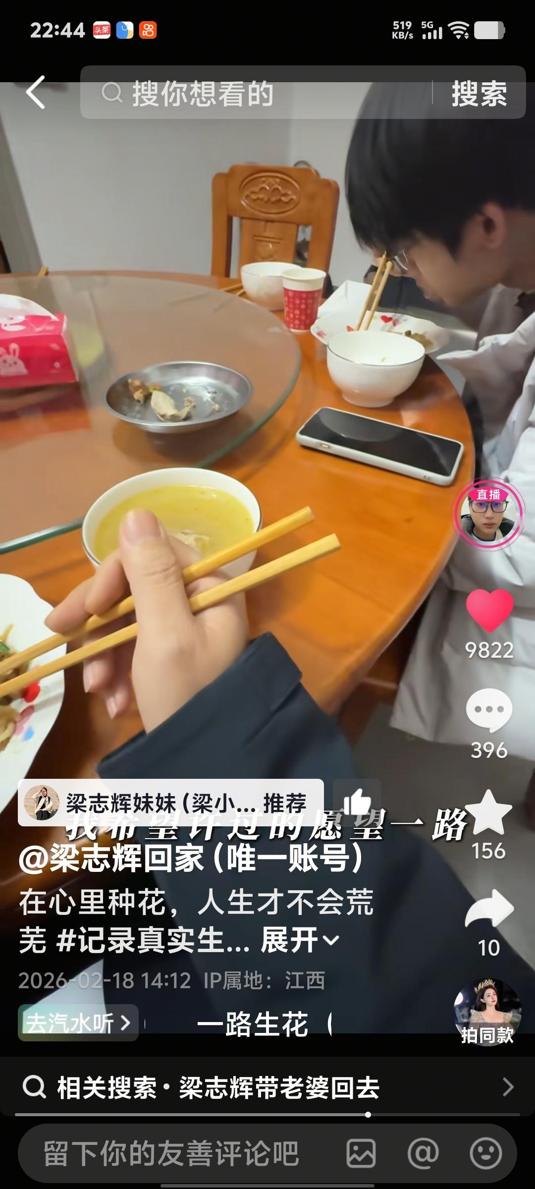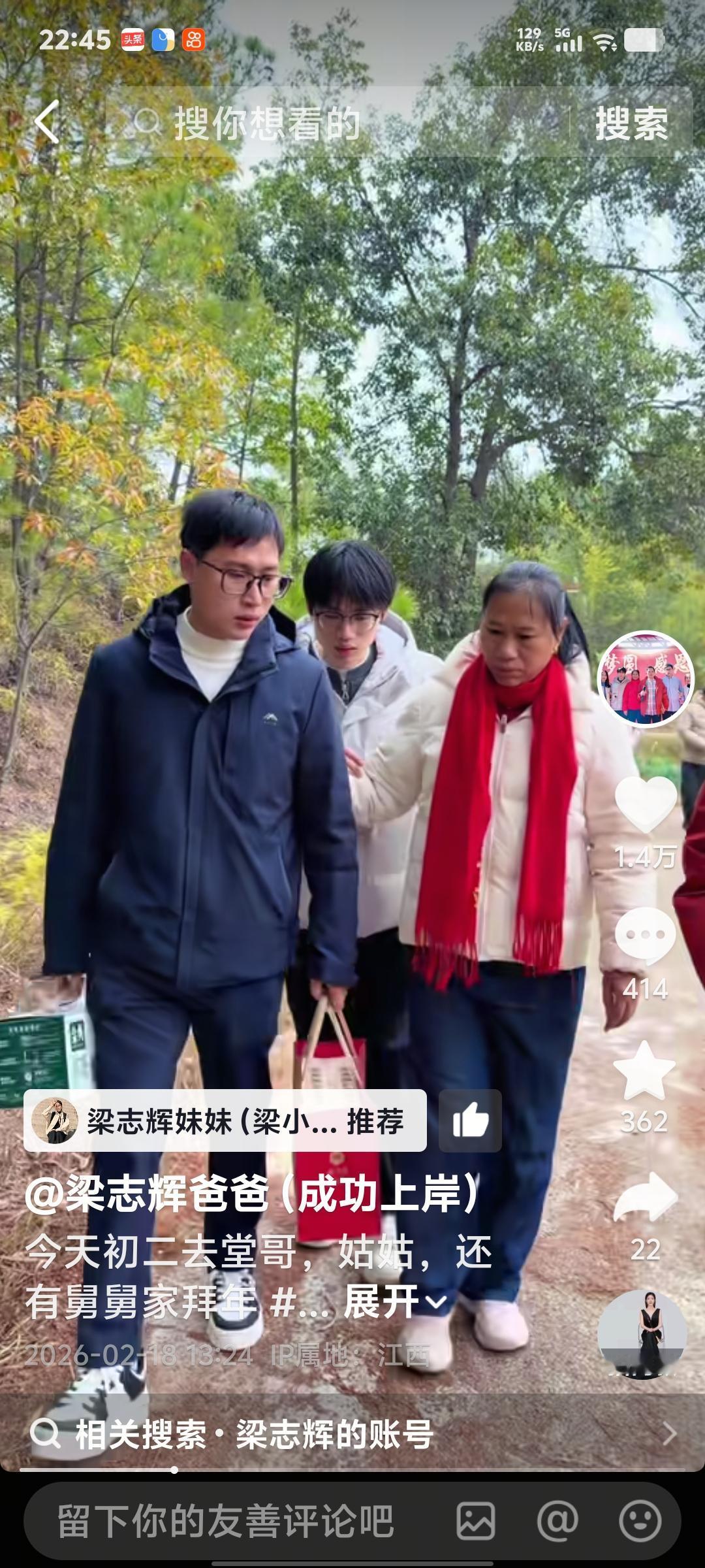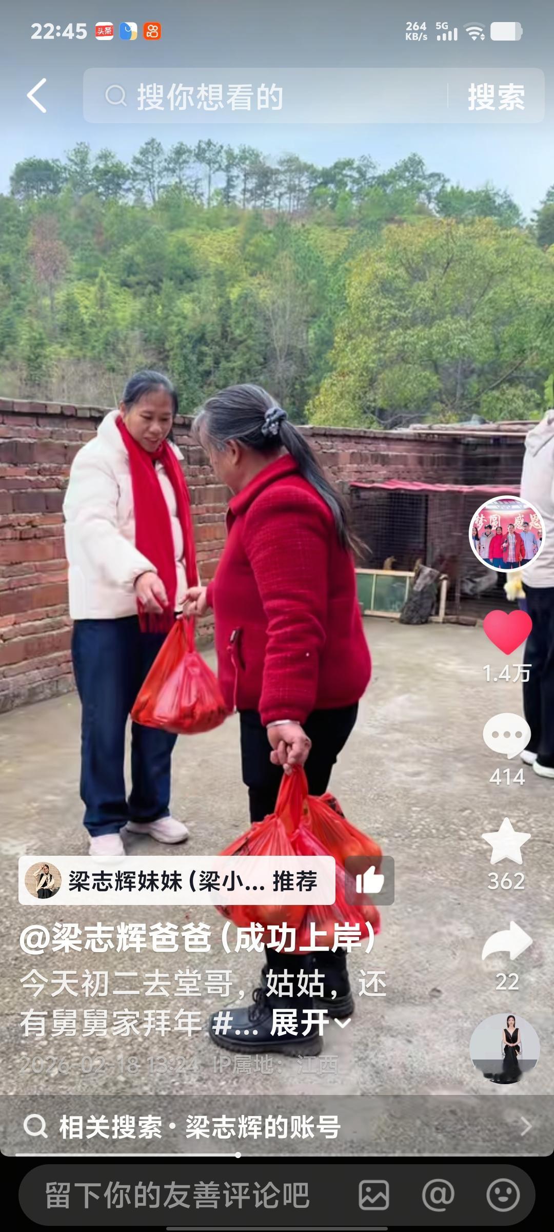 梁志辉今天陪着爸爸妈妈走亲戚,去了堂哥家,叔叔家,舅舅家,小姨家,收了不少大红包儿。梁爸爸嘴巴都笑歪了。 刚认亲的时候,觉得这个孩子老实,木讷,不爱说话。哎。但是第一个年提着礼物啊。悄么声的就回家了。 好感度一下子就来了,这孩子还真孝顺。不会玩虚的。实实在在陪爸爸妈妈过年。 老两口的牙齿。一直都在外面晒太阳。乐的合不拢嘴。好酒,好菜摆上桌。吃饺子,放烟花。 弟弟妹妹也都回来了。过了一个热热闹闹的新年。今天走亲戚。看到网友们心里都暖暖的。 有人欢喜就有人愁。郁豹豹也是寻亲的孩子。可惜原生家庭拎不清。导致他一个人孤零零的过年 希望2026年团圆的光照在还没找到孩子的家长身上。让他们早日团圆。