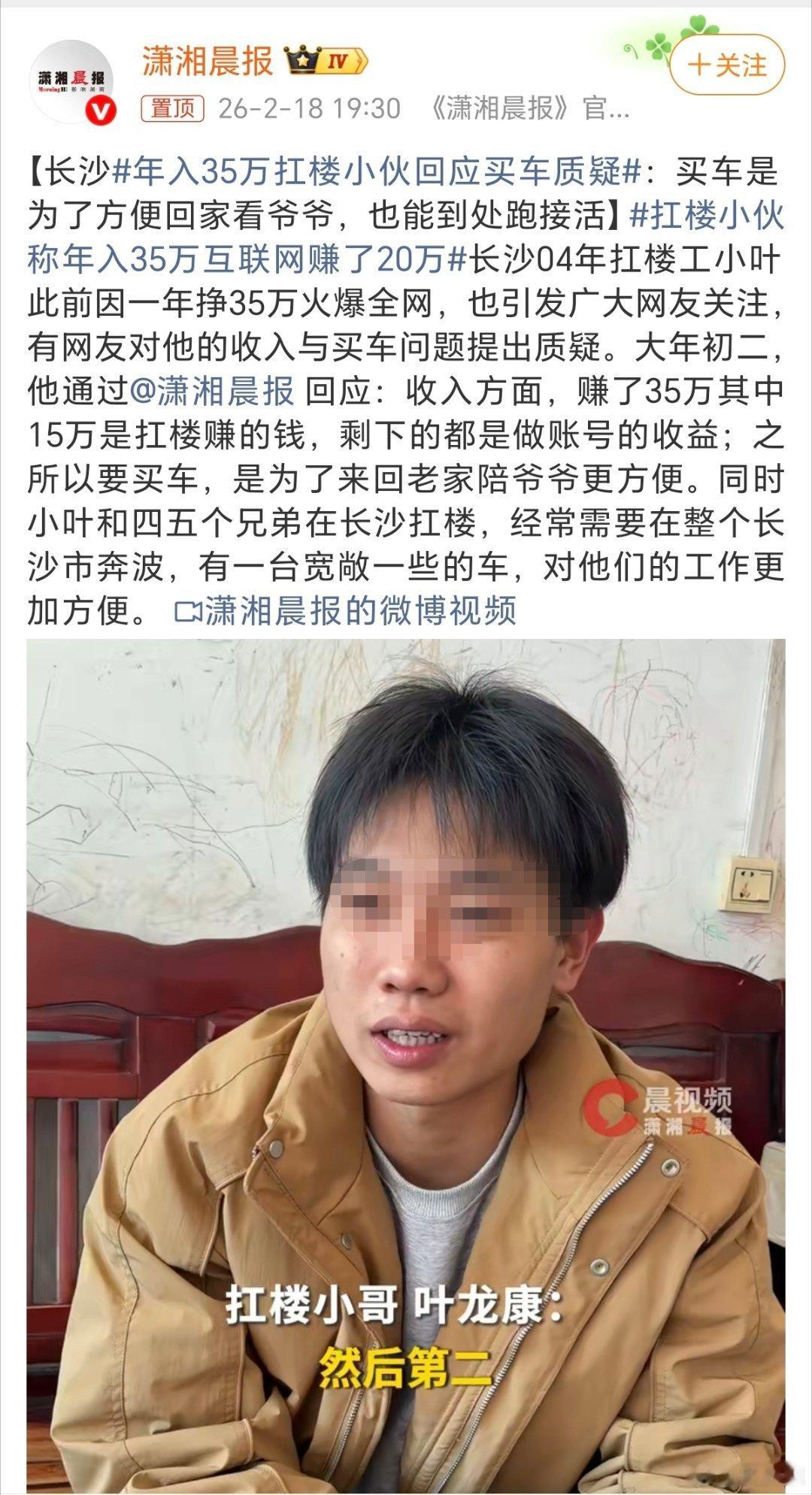 年入35万扛楼小伙回应买车质疑靠自己勤劳的双手致富,这没啥好质疑的。