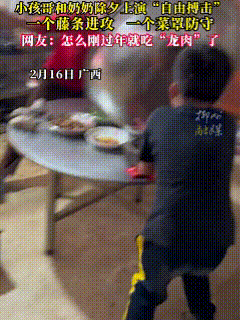 这是触犯“天条”了吗?2月16日除夕,广西农村一家的奶奶和孙子,这二人上演了一场令人心惊肉跳的“自由搏击”,看完视频的网友挺不淡定,好多人直呼:“这是触犯天条了吗?” 通过视频可以看到,奶奶拿着东西在抽打孙子,孙子拿着菜罩防护自己,这一来一去好几个回合,吓得孙子喊来喊去,愣是没人上前帮忙。反观这个奶奶,似乎挺生气,打的不可开交。对此,好多人网友不禁要问。 有人说:“一直以来,不都是奶奶疼爱孙子吗?怎么这个奶奶打的如此之猛呢?也许孙子真的触犯了什么禁止的或者传统,不然大过年的不可能这样的。”有人说:“也许这孩子很熊,估计干了什么破坏了除夕的气氛。” 虽然不知道奶奶为啥打孙子,但笔者跟很多人想的一样:不出意外,是孙子做了什么大错特错的事。不过,孩子犯错该教育是得教育,可教育的方式不应该只有挨打,也许换个其他方式会更加有效,你说呢?