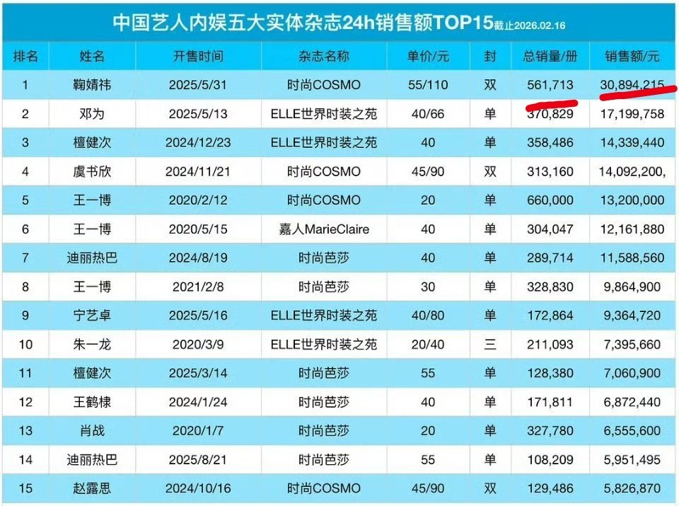 内娱艺人五大实体杂志24h销售额最新排名鞠婧祎全明星top1