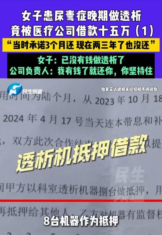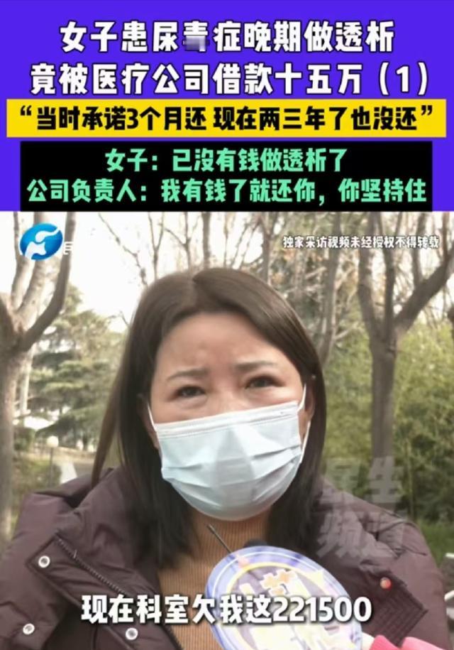 河南许昌,女子得了尿毒症,做透析时认识了科室负责人,对方借走她15万,承诺3个月归还,3年过去了,女子已经到了晚期急需换肾,可对方借她的钱迟迟不还。女子多次找她要钱,对方称:我有钱了就还你,你坚持住! 河南许昌这件事,最刺眼的不是情绪性的描述,而是两笔钱摆在一起时,那种不成比例的残酷:杜女士拿出去的是15万元,她后来收到的“还款”只有200元,而且还是拖了三年之后才甩回来的。 数字一对照,就能明白她为什么会崩溃——那不是少还一点的问题,而是把人往绝路上逼。 事情拖到2026年,距离借钱已经三年,对多数人来说,三年可能只是换了份工作、搬了个家,但对一个尿毒症患者来说,三年意味着一轮轮透析、一次次抽血化验、反复的指标波动和并发症风险。 她是透析八年的病人,生活基本被医院和机器切割成固定节奏:哪天去、做多久、做完人虚成什么样、下一次能不能撑到,钱对她不是“存款”,更像是把生命往后推一段时间的燃料。 很多人不理解:明明是救命钱,为什么会借出去?但这正是这件事最可怕的地方——她借的对象,恰好在她的生活里,处于一个极特殊的位置。 杜女士长期在一个科室做透析,熟到不能再熟,你每天都要来这里,把自己交给这套系统:机器、耗材、护士、医生、排班、费用结算。 2023年,对方张某某向她开口时,用的理由是“采购耗材需要周转”,这种说法,对一个长期在医院里的人来说,是很容易被说服的。 科室确实要耗材,透析相关耗材天天用,谁都知道这不是“可有可无”的东西,再加上对方的身份在患者眼里带着权威感,杜女士的防备就被压得更低了。 她当时的出钱方式很明确:10万元转账,另外5万元是现金,对方开出的条件,听起来也很“漂亮”:说三个月就还,还承诺每月给1500元生活补贴、3000元利息,甚至说可以拿科室里8台机器做抵押。 对杜女士这种没有稳定收入、身体又不允许去做重活的人来说,这些话像是把“风险”包装成了“保障”:看起来有利息、有补贴、有抵押物,像是一笔稳当的交易。 但问题在于,从一开始这就不是对等的交易,债务人如果同时掌握着,你就医环境里的话语权,你就很难像普通债权人那样追债。 三个月一到,对方不还,她也不可能像对普通欠款人那样,天天堵门、拉横幅、公开曝光——她第二天可能就要躺上那台机器。 她能做的只有私下催、轻声问、尽量不把关系搞僵,于是拖延,就变成了对方最省成本的策略:今天说“没回款”,明天说“再等等”,拖到最后就成了“有了就还”。 这一拖就是三年,到2026年,杜女士的身体情况更差了,透析频率加密到两天一次,这意味着她的时间、精力和经济承受都被进一步压缩:花费更高,身体更累,能去做别的事的可能性更低。 她原本攒下来的那15万元,本来是为肾移植做准备的钱——对很多尿毒症患者来说,这是唯一可能改变生活的路,但现在钱不在自己手里,病情又在往晚期走,连日常透析费用都开始吃紧。 当地卫健部门介入后,院方在调解场合的说法是:科室不允许承包,张某某只是“耗材供应商”。 可现实中的细节又很难让人信服,一个供应商,为什么能在科室内部,形成那么强的控制感?为什么会出现“发工资”“管理科室运行”这类传言?如果医院真的牢牢掌握管理权,科室账户为什么会因张某某的个人外债被法院查封? 这些疑点放在一起,就让人很难把它当成简单的“供应商和患者的私下借贷”,更像是某种灰色操作长期存在:明面上不叫承包,实质上由外部人员深度介入甚至控制科室运转。 按理说,这样的借款纠纷在证据层面并不难,协议、转账记录、双方沟通内容,如果都能拿出来,赢官司的可能性不低。 但杜女士面临的现实是另一层:判决赢了不等于钱能执行回来,账户被封、对方名下,可能没有可供执行的资产,或者干脆摆出“我就这样”的态度,执行会非常艰难。 对一个需要持续医疗支出的患者来说,“慢慢走程序”四个字,几乎等同于让她用生命去等。 几天前调解现场出现的一句话,更是把这件事的冷血程度,直接暴露出来,杜女士说自己“顶不住了”,对方却回了一句“顶不了了你坚持住”。 这种话放在任何场合都刺耳,放在患者面前更像嘲弄,更让人窒息的是,对方所谓“前几天还了”,指的就是那200元——把象征性的施舍包装成履约,既不解决问题,也是在消磨对方最后的尊严。 15万元对张某某也许只是一个“周转数”,对杜女士却是维持治疗、争取移植机会的唯一底牌,把这张底牌拿走再拖三年,等于把一个人的希望拖到见底。 如果说最该被追问的是什么,恐怕不只是“张某某什么时候还钱”,还包括:这样的灰色空间,为什么能存在这么久?谁在管理、谁在放任、谁在出面切割?因为对一个长期透析的病人来说,她能依靠的只有制度,而不是某个人的“良心”。