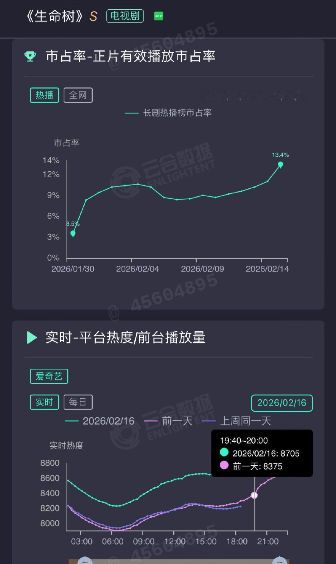 大年三十,春晚都压不住一部剧的热度。 杨紫、胡歌主演的《生命树》直接把网播量干到了8700新高。 要知道,这可是跟全国关注的春晚正面硬刚。 它不光没被春晚抢走流量,热度反而还涨了。 这事儿告诉你,好内容才是王道,管你什么节日大IP。 别再迷信流量明星了,演技和剧本才是收视率的硬通货。