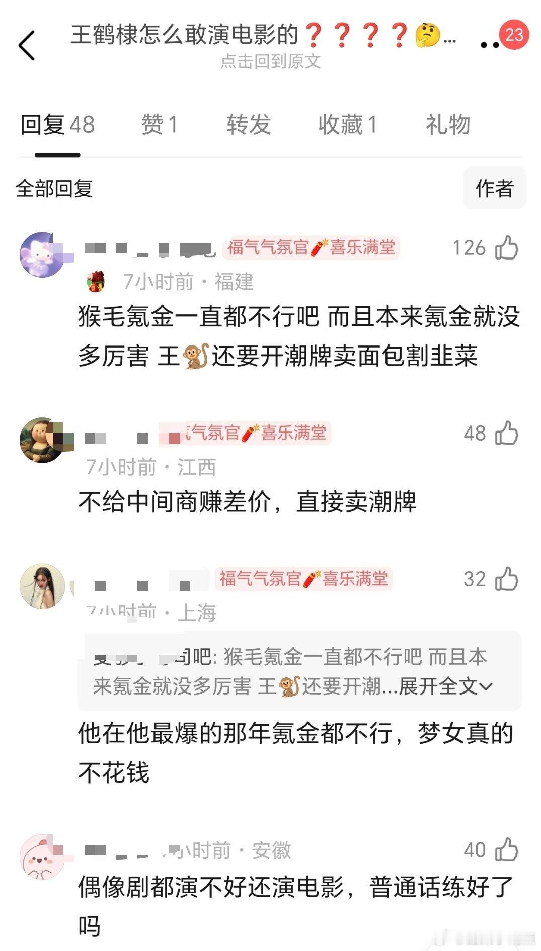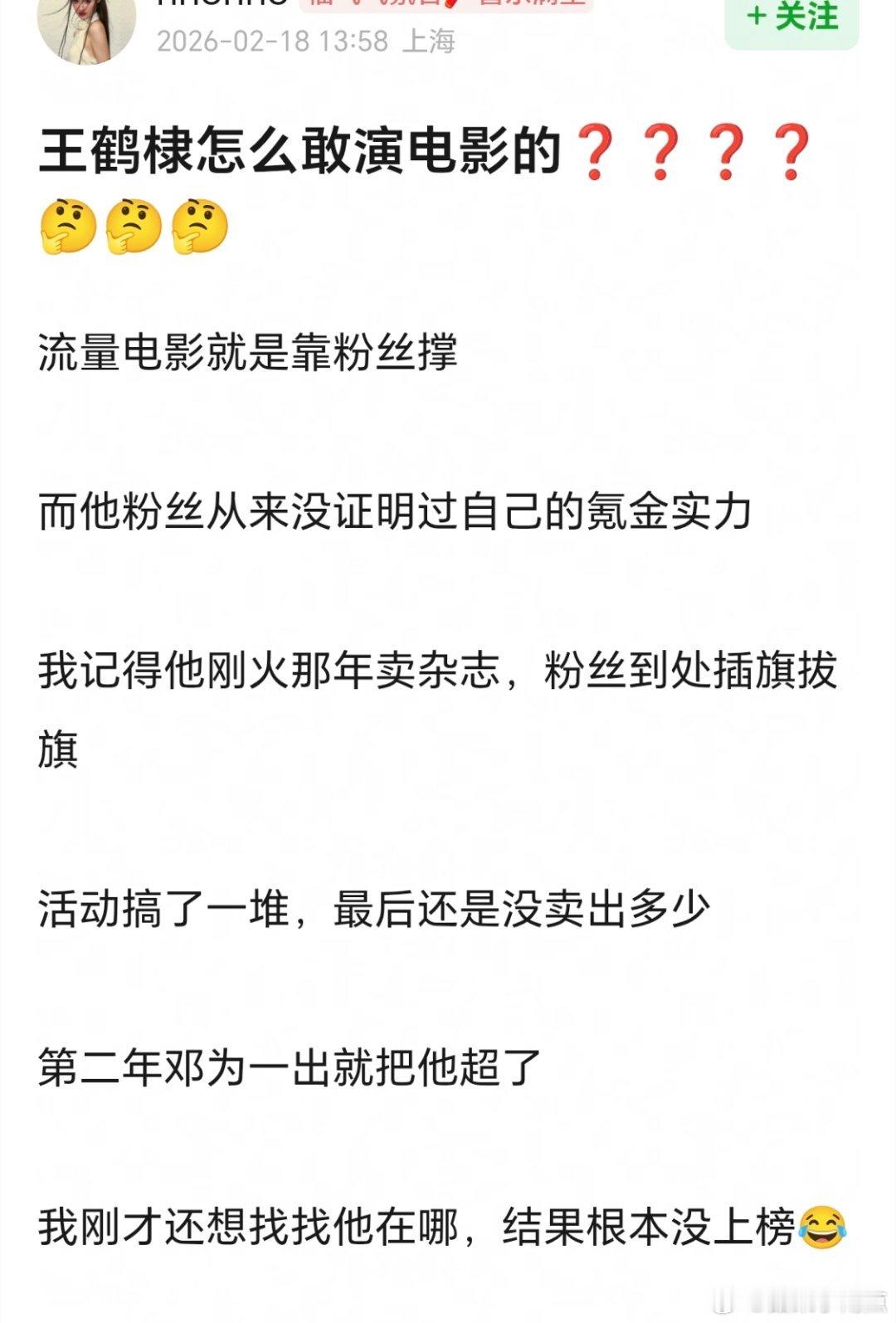 《星河入梦》扑成这样是不是跟一番王鹤棣撑不起来有很大的关系?正常来说电影预售票房和上映第一天都是靠粉丝实力撑起来,然后发酵口碑引路人进场…而他最火的时候杂志没卖起来,第一部大荧幕男主又血扑,河堤的荧幕梦怕是已碎…🙊